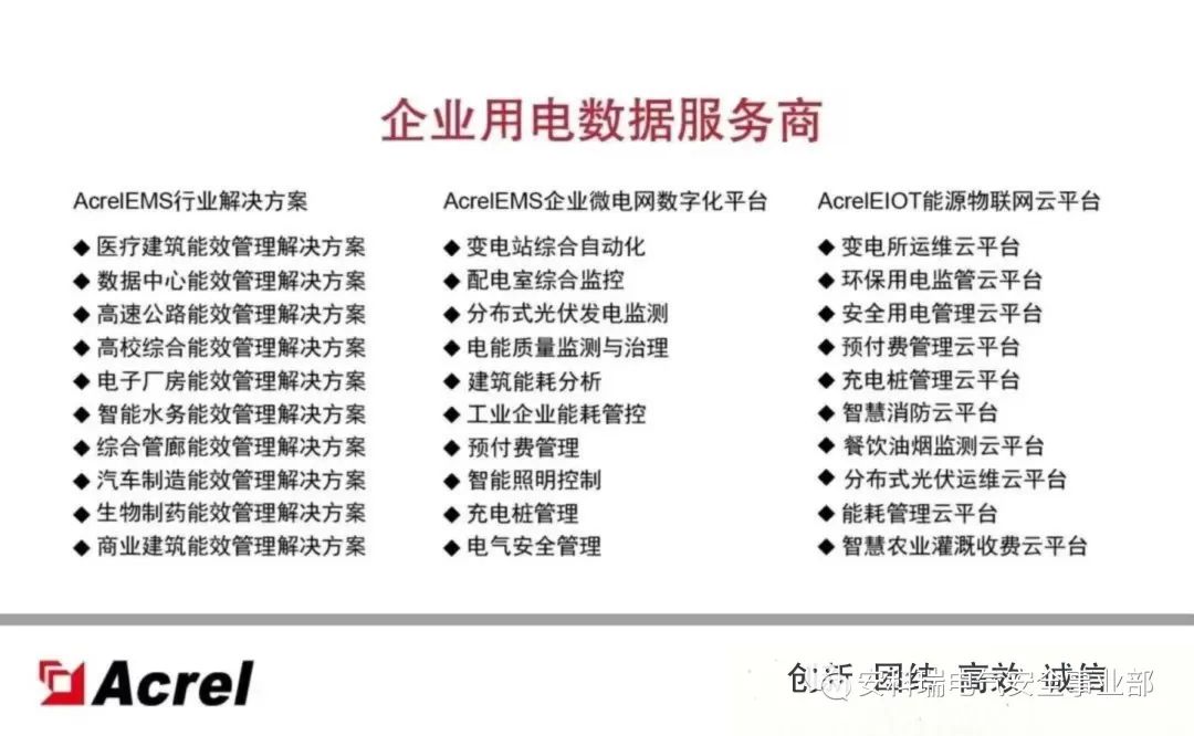 Acrel Co., Ltd. has a product ecosystem ranging from cloud platform software to terminal components. Currently, more than 10000 sets of system solutions are running across the country, ensuring the safe use of energy by users. The solutions provided by Acrel include substation operation and maintenance cloud platform, safe electricity management cloud platform, environmental electricity supervision cloud platform, smart fire cloud platform, energy management cloud platform, industrial enterprise energy control platform, remote prepaid cloud platform, catering oil fume supervision cloud platform, electric vehicle charging pile fee management cloud platform, power monitoring/wireless temperature measurement system, power quality management system, electrical fire monitoring system, fire equipment power monitoring system, fire door monitoring system, emergency lighting and evacuation indication system, intelligent lighting control system, medical isolation power insulation monitoring system, etc., helping users achieve intelligent, visual, and refined energy management, improving energy efficiency and safety, and providing data services for enterprise energy conservation and digital energy construction.