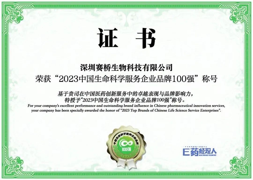 「赛桥生物」荣获“2023中国生命科学服务企业品牌100强”称号