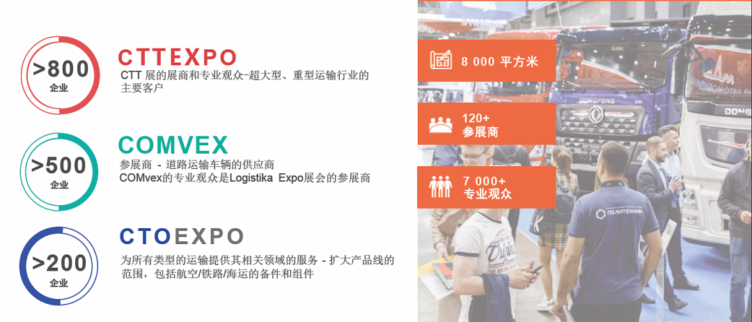 Logistika Expo 是物流和运输服务、货运代理、运输设备、技术、IT开发和供应链管理的国际展览会。Logistika Expo 将与 CTT Expo、CTO Expo、COMvex 同期举办,四大展会的协同作用将在 Crocus Expo 展馆最大限度地发挥,为参展商和专业观众带来优异的效果。四展协同办展将占据 Crocus Expo 整个室内外展馆,总面积超过 25 万平米,这将是 2024 年东欧最大的展会项目之一。高度契合的展商和访客可在不同的展馆区域内找到适合自己的目标客户群体,有助于高效解决来访者的诉求,将最大化地发挥展会的协同作用。
