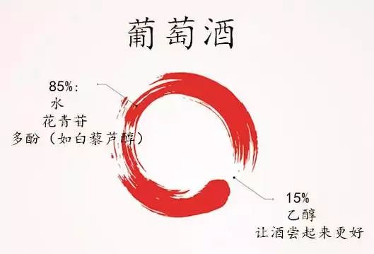 85%为有益成分:在葡萄酒中,水、花青苷(一种抗氧化剂)、包括单宁和白藜芦醇(Resveratrol)在内的多酚(Polyphenols)占了绝大部分,这些都是对人体有益的。