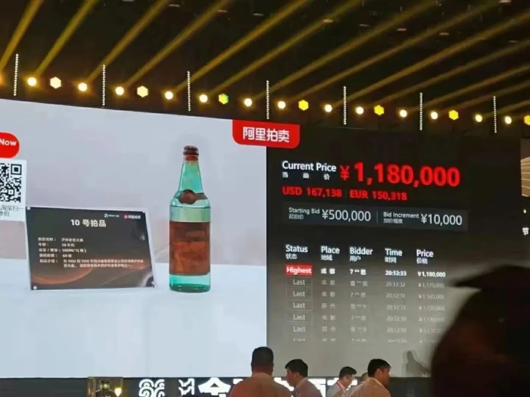 在“2021阿里拍卖全球老酒节”拍卖之夜上,一瓶上世纪50年代的泸州老窖以118万元的高价成交,引发市场强烈关注。而早在2013年,1963年的一组泸州老窖年份老酒就拍出惊人的1100万元,刷新了1952年一组泸州老窖金奖年份老酒1035万元的历史纪录。