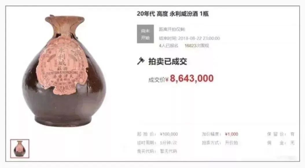 2010年9月1瓶汾酒拍出209万元天价,在这场于北京举行的拍卖会上,20瓶国藏汾酒以3076万元的总价拍出,其中单瓶最高的价格为209万元,刷新了之前由茅台保持的单瓶103万元的国内白酒拍卖纪录。2018年8月首届京东超级拍卖节上,一瓶永利威汾酒以864.3万元的成交价再次刷新了拍卖记录。