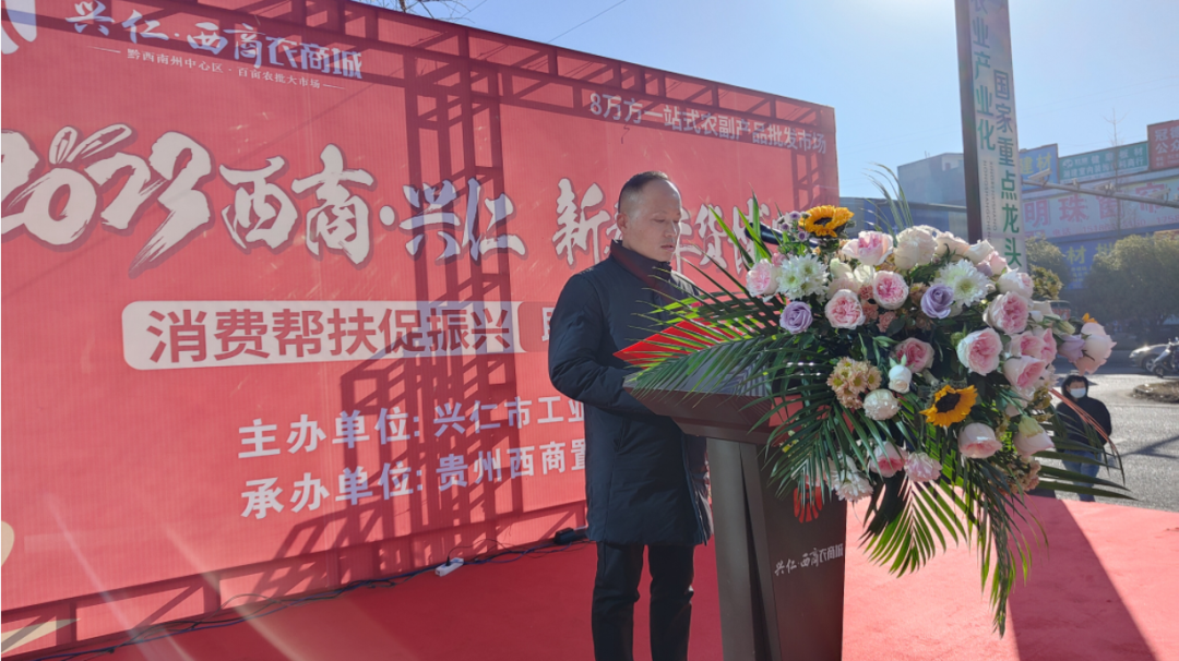 2023年1月7日,万众期待的2023西商·兴仁新春年货博览会开市了。兴仁市工业和科学技术局局长何忠祥、兴仁市市场监督管理局局长蒋福彪、兴仁市城南街道办事处副书记王军、兴仁市供销社主任彭发祥、副主任曾翀等人出席了本次博览会开市活动。