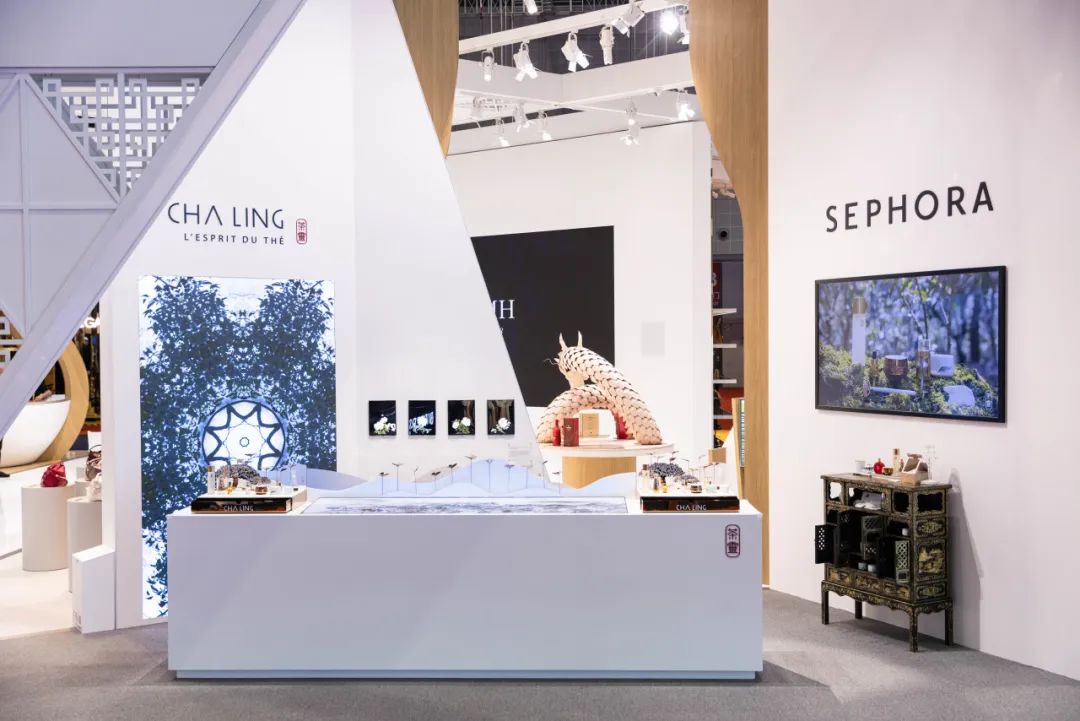 除此之外,LVMH 集团旗下高端美妆零售商 Sephora 在本届展会第三度携⼿中法奢华护肤品牌 Cha Ling 茶灵亮相,打造古老与现代茶文化相互碰撞而出的独特通感盛宴,以此致敬中国文化。