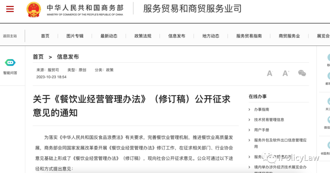 为落实《中华人民共和国反食品浪费法》有关要求,完善餐饮业管理机制,推进餐饮业高质量发展,商务部会同国家发展改革委开展《餐饮业经营管理办法》修订工作,在征求相关部门、行业协会意见基础上形成了《餐饮业经营管理办法》(修订稿),现向社会公开征求意见。公众可通过以下途径和方式提出意见:一、通过登录商务部官方网站(网址:http://www.mofcom.gov.cn/),在首页“互动交流”栏目中的“征求意见”提出意见。二、通过电子邮件发送至sanchu@mofcom.gov.cn,邮件主题请注明“餐饮业经营管理办法公开征求意见”。三、通过信函邮寄至北京市东城区东长安街2号商务部服贸司(邮政编码:100731),并在信封上注明“餐饮业经营管理办法公开征求意见”字样。商务部服贸司