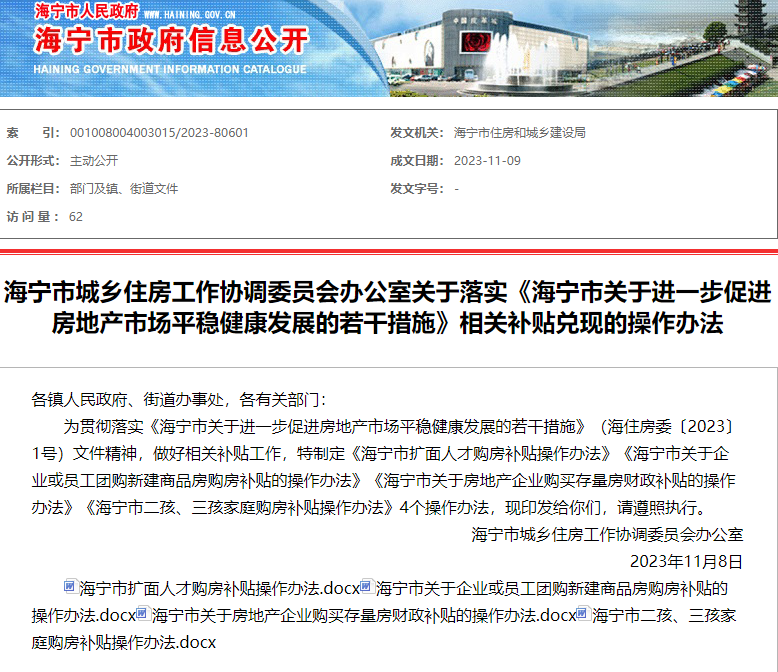11月9日,杭州第13批次10宗宅地挂牌,之前传言的土拍新规终于到来:②上城、拱墅、滨江、西湖、萧山、余杭六区依然限房价,富阳、临安、临平、钱塘四区房价不再设限。今年9月底,自然资源部下发有关文件,文件建议各省市自然资源部主管部门,取消土地拍卖中的地价限制、建议取消远郊容积率1.0限制等。全国22个集中供地城市中,有19个城市相继发布新挂牌宅地公告,包括杭州在内的16城不再设置地价上限;郑州的部分城区依然限制了地价;仅北京、上海则维持地价、房价“双限”。【详情】近日,江苏省高级人民法院、江苏省住房和城乡建设厅、中国人民银行江苏省分行共同制定《关于做好住房公积金个人住房贷款购买法拍房业务的实施意见》,对公积金贷款购买法拍房业务的相关事项作出规定。根据《实施意见》,公积金法拍贷业务适用于各级人民法院对江苏省内个人住房组织网络司法拍卖的活动,由各地住房公积金管理中心或受其委托开办住房公积金个人住房贷款业务的商业银行受理。符合住房公积金个人住房贷款条件的法拍房买受人,可在未付清全款前办理住房公积金个人住房贷款。3、南通:合理确定住宅用地出让价格 取消单宗商品住宅用地限价要求南通市住建、人社、资规、行政审批等4个部门联合印发《优化中心城区房地产业发展若干措施》。其中提到,合理确定住宅用地供应规模,进一步优化住宅用地供应布局和结构,加大改善型住房供应比例,精心挑选优质地块,统筹安排供应总量,合理把握供应节奏。有序推进城市更新和拆迁安置项目,科学确定保障性限价房用地供应规模。持续优化住宅用地供应政策,合理确定住宅用地出让价格,取消单宗商品住宅用地限价要求。4、四川宜宾:组团购买10套及以上购房群体,每套补贴15000元11月6日,四川宜宾市房地产市场调控协调机制办公室发布了关于印发《进一步促进房地产市场平稳健康发展若干政策措施(试行)》的通知(以下简称“通知”),涉及鼓励住房消费、服务企业发展、强化住房保障、规范市场秩序4大方面。在大力支持团购方面,2023年11月6日至2024年3月31日期间,在宜宾市主城区同一新建商品住房开发项目,组团购买10套及以上住房的购房群体,按15000元/套给予团购补贴。团购补贴按购买新建商品住房套数享受,且可以与购房补贴叠加享受。