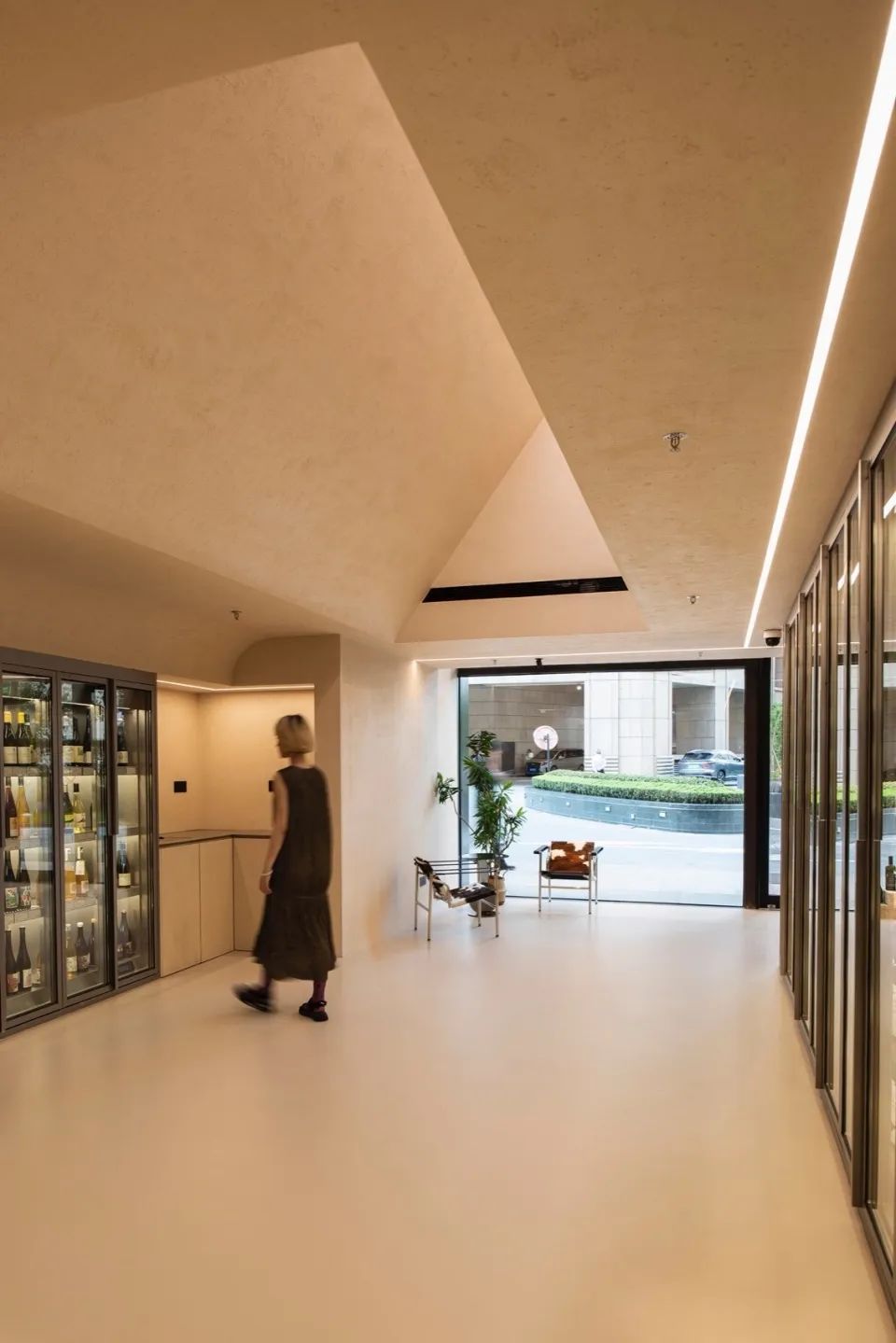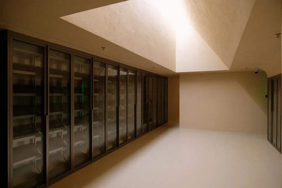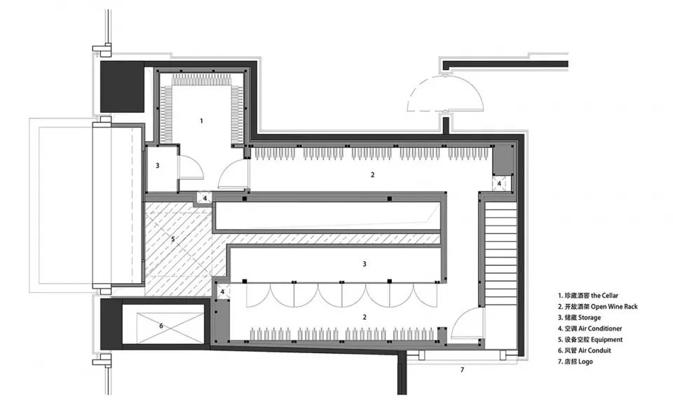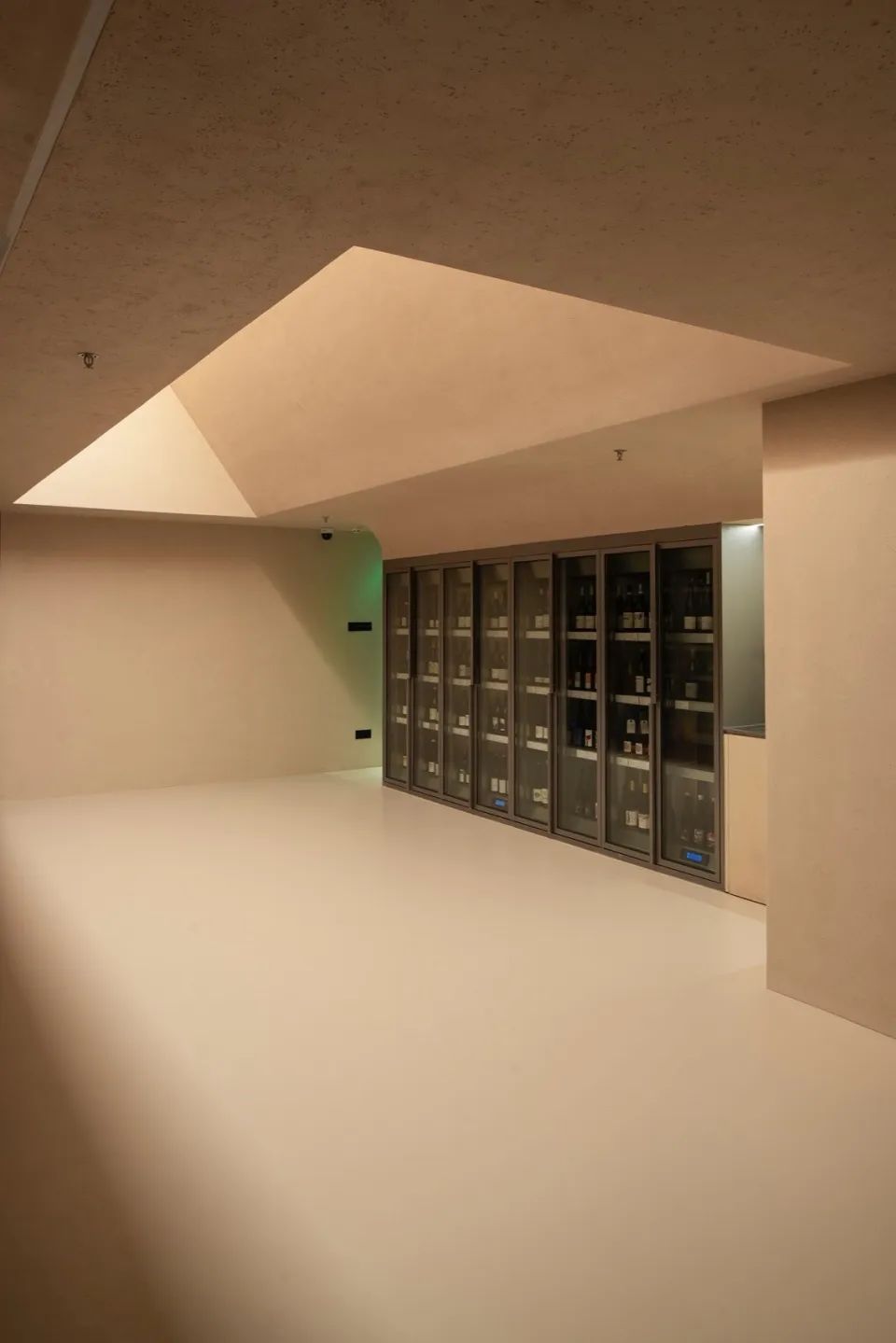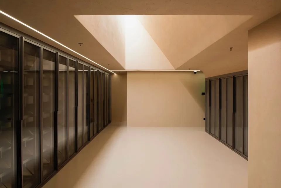 方形是主导空间形态,构建出一层展示销售区,阁楼存酒廊和珍藏酒窖三个功能性区域;三角形的顶光定义出美术馆的气质;圆形以1/4弧完成了顶与墙的衔接。