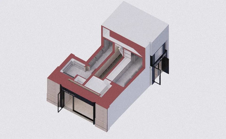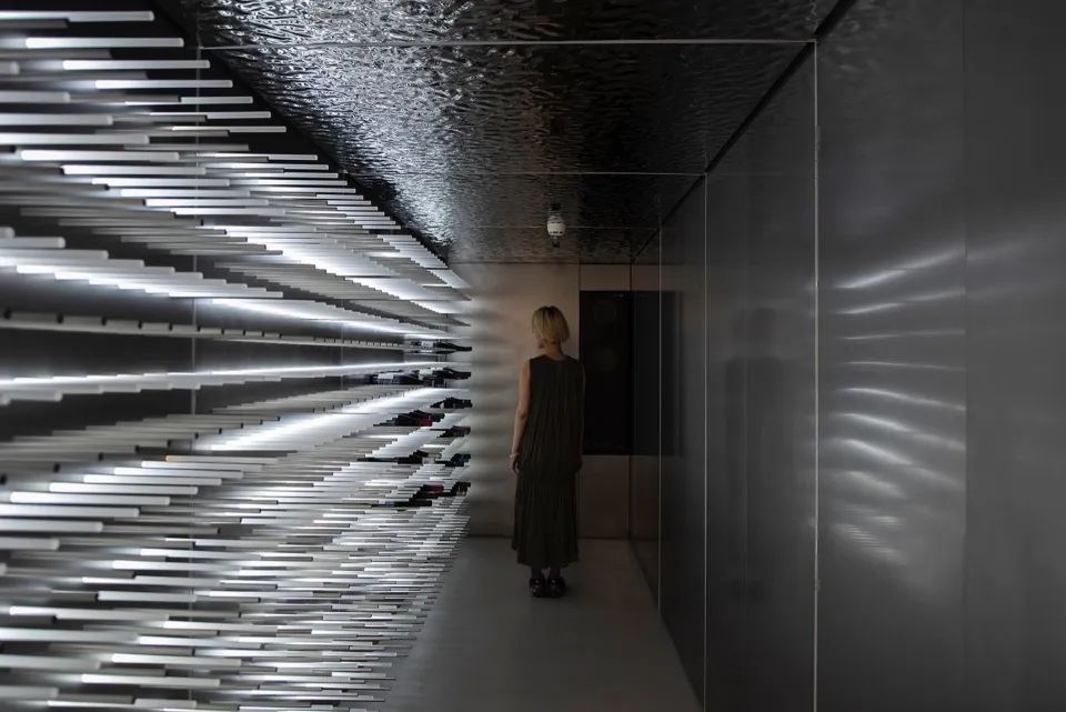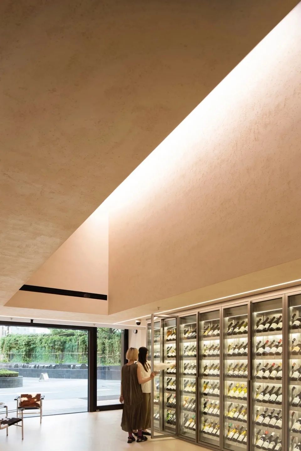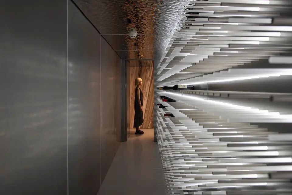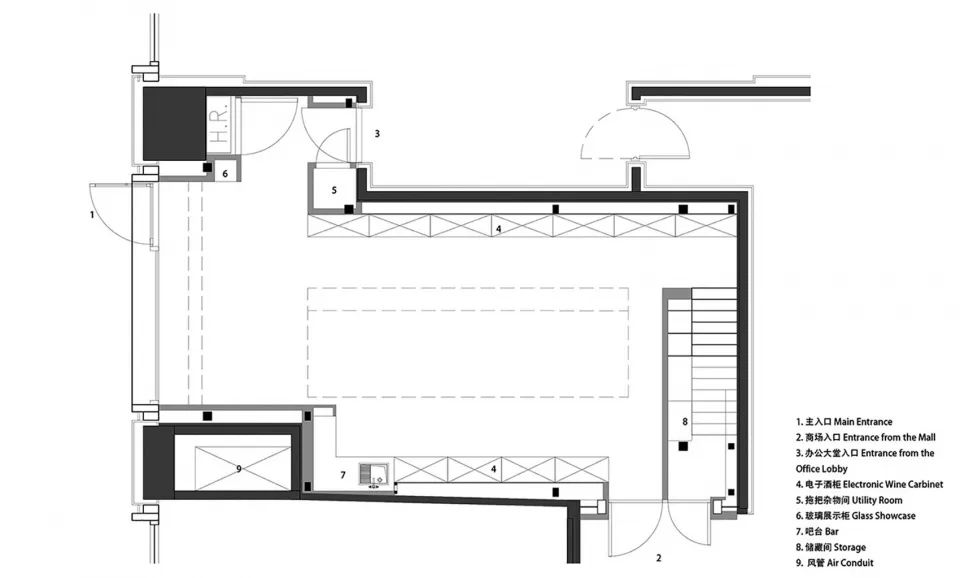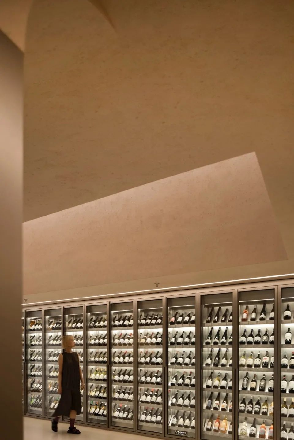 方形是主导空间形态,构建出一层展示销售区,阁楼存酒廊和珍藏酒窖三个功能性区域;三角形的顶光定义出美术馆的气质;圆形以1/4弧完成了顶与墙的衔接。