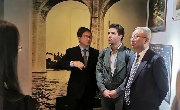 DESTOUCHES校长在姚校长的陪同下参观了上海工商外国语职业学院和思博职业技术学院两所学校的校园,随后参观傅雷生平陈列馆后在我校欧式文化长廊合影留念。