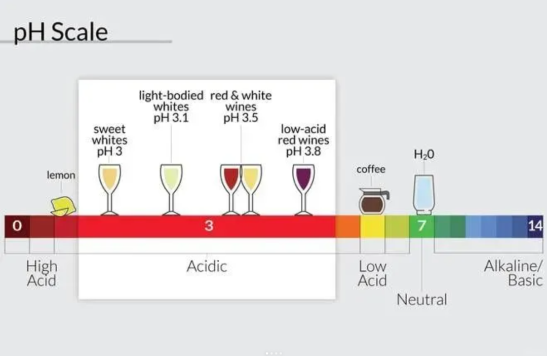 所有类型的葡萄酒都具有一定的“酸”度,而且它们的pH值大多都在3-4之间。理想情况下,白葡萄酒pH值在3.0-3.4之间,而红葡萄酒在3.3-3.6之间,低于咖啡,但比柠檬水稍高。