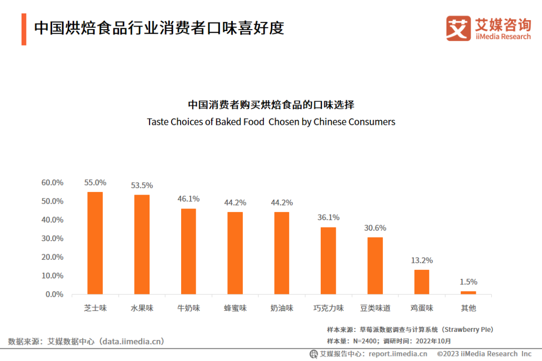调研数据显示,消费者购买烘焙食品时选择芝士味、水果味的超50%,选择牛奶味、蜂蜜味、奶油味的在40%左右。艾媒咨询分析师认为,消费者对烘焙食品口味偏好较多样化,企业可以调整产品口味或者进行口味创新以迎合消费者多元化的口味需求。