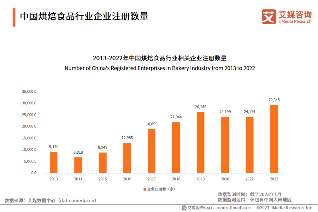 数据显示,2022年中国烘焙食品行业相关企业注册数量为29345家,2020-2022年烘焙食品行业企业数量增长较为强劲,2022年创下历史新高。艾媒咨询分析师认为,中国烘焙食品行业尚未达到饱和,市场还具有很大的发展空间,预计未来更多企业会加入烘焙赛道。