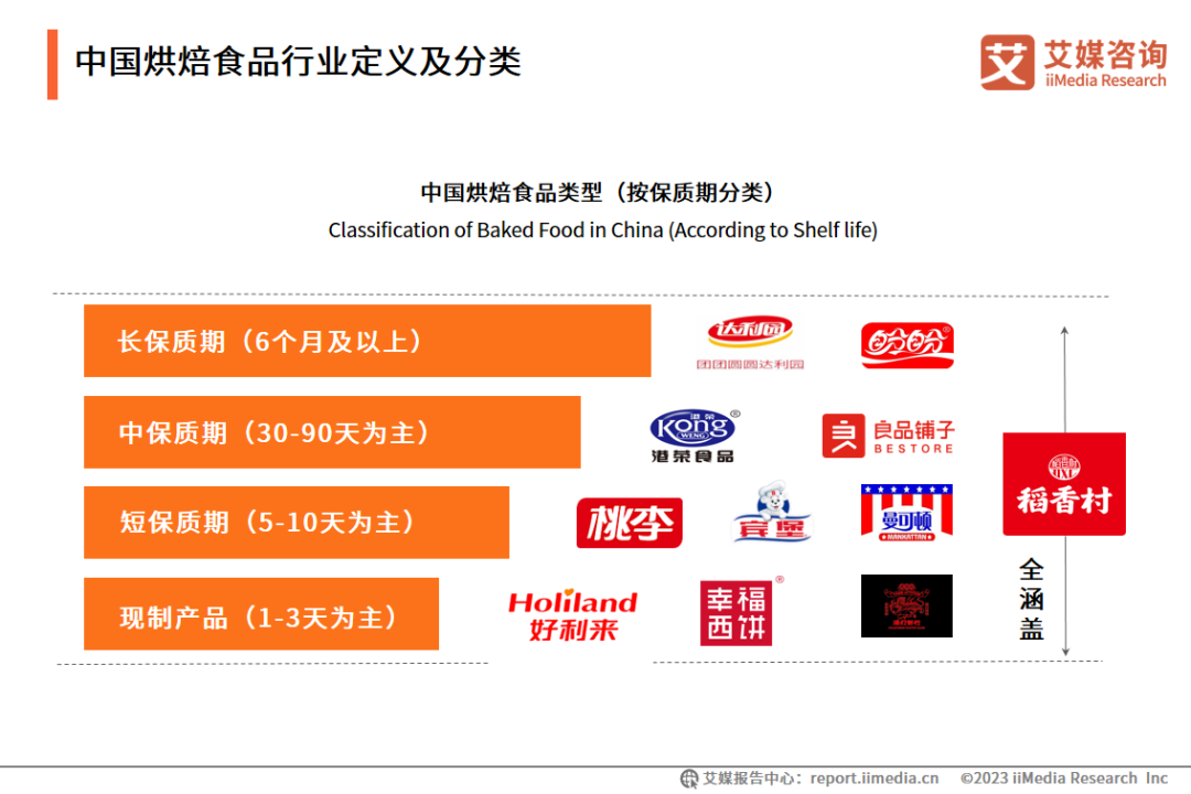 烘焙食品是以面粉、酵母、食盐、砂糖为主料,油脂、乳品等为辅料,经过一系列工艺手段烘焙而成的食品。从保质期看,烘焙食品可分为现制、短保、中保、长保四类,代表品牌有稻香村(苏州)、好利来、桃李等,其中稻香村(苏州)产品矩阵广泛涵盖各保质期类型。