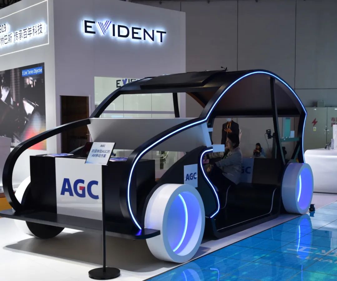 日本“玻璃大王”AGC集团今年以“引光聚力共享智慧未来”为主题打造展台,展示丰富多彩的材料技术和产品。AGC展台的互动性和沉浸式是一大亮点,以互动地屏的形式向新老朋友展现公司旗下建筑玻璃、汽车、电子、化学品、生命科学、工业陶瓷六大事业领域的开拓历程。位于展台入口的模型汽车集合车载显示器盖板玻璃、车载投影屏、星空顶天幕、车载装饰盖板玻璃等,利用AR互动,让参观者沉浸式体验到“光”如何为不同应用领域提供价值。