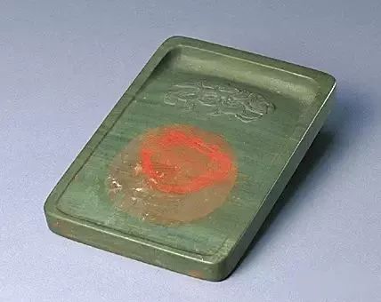 砚石肌为横向纹理,绿色浓淡相间,清晰美观,石质易发墨。此砚制作讲究,为清康熙朝宫廷特制的御用砚。