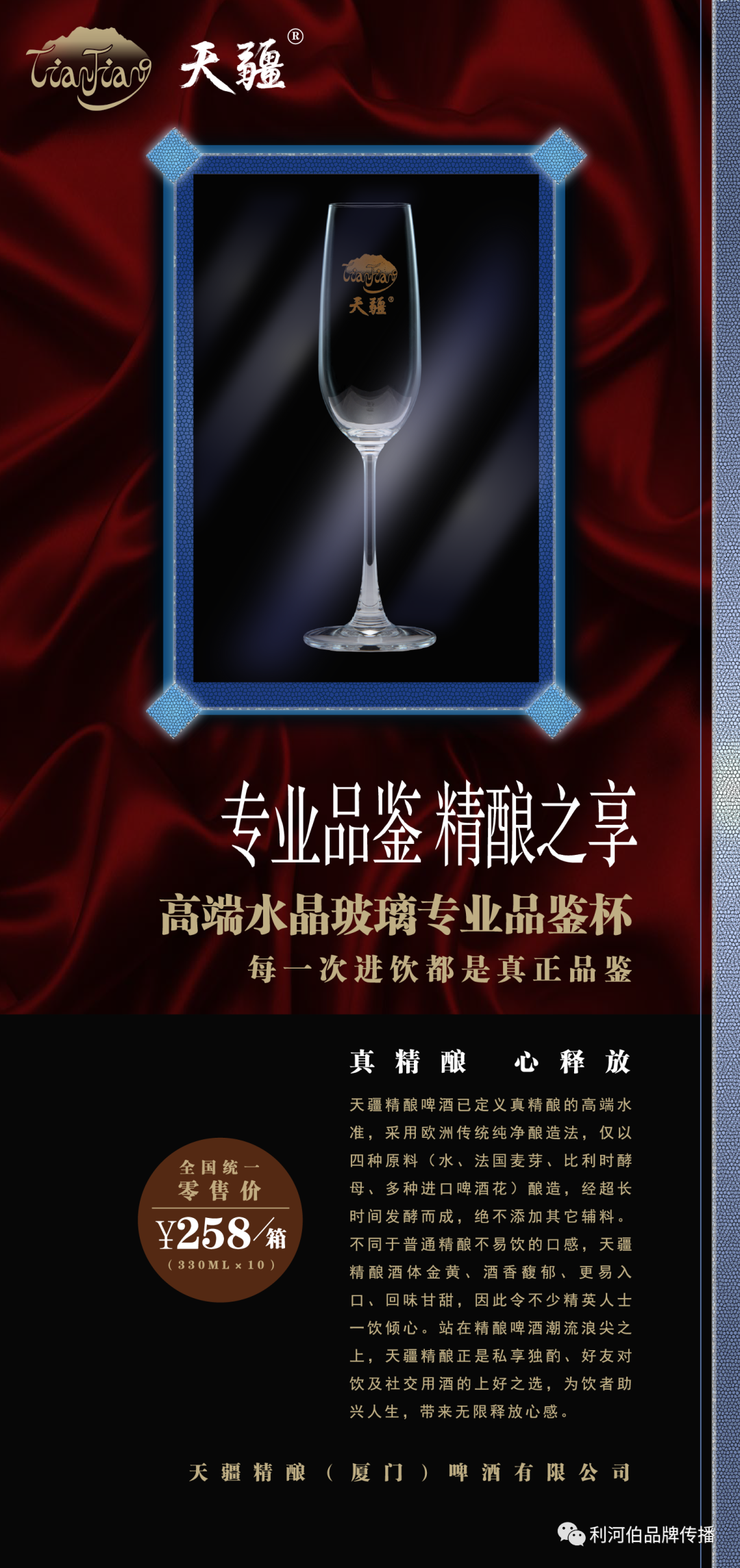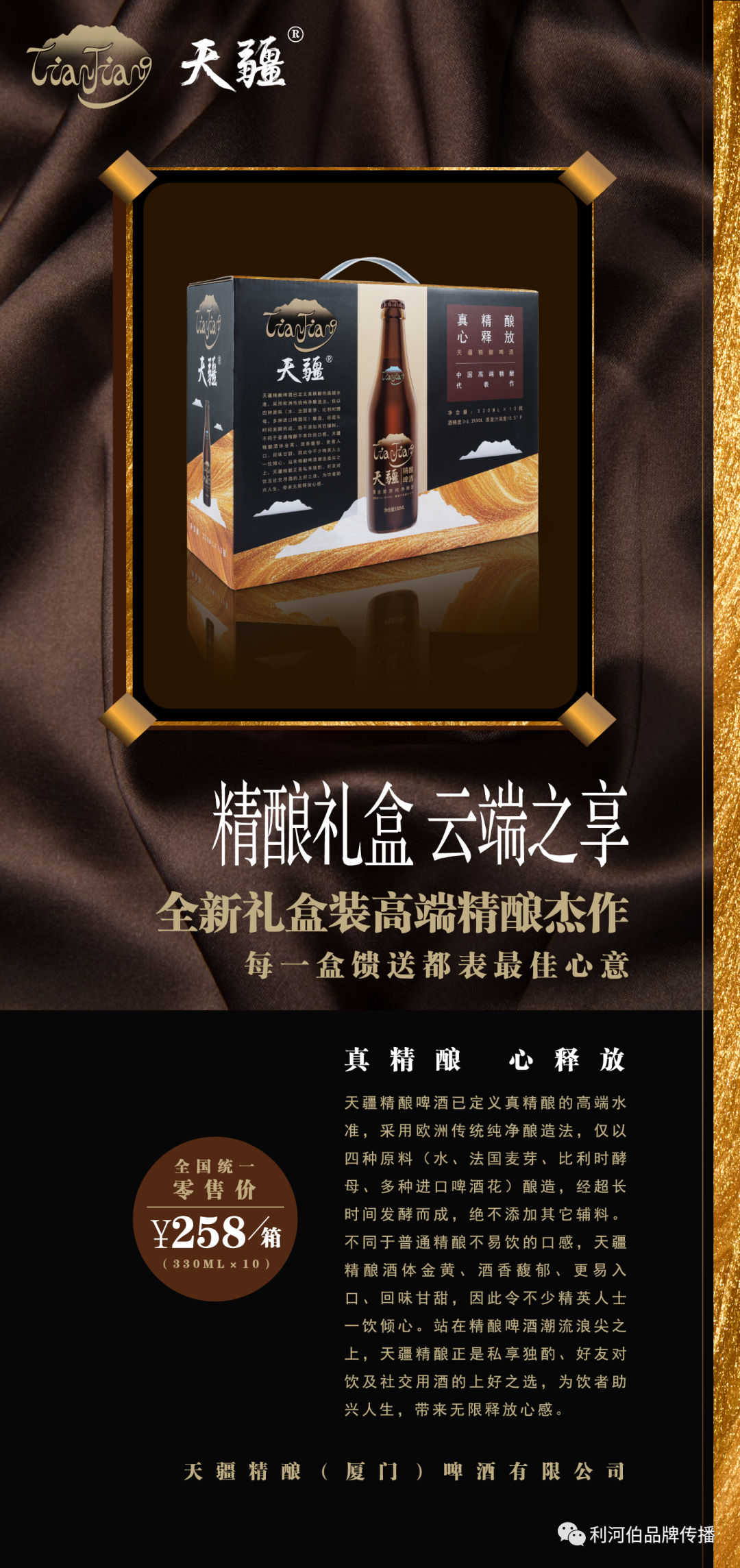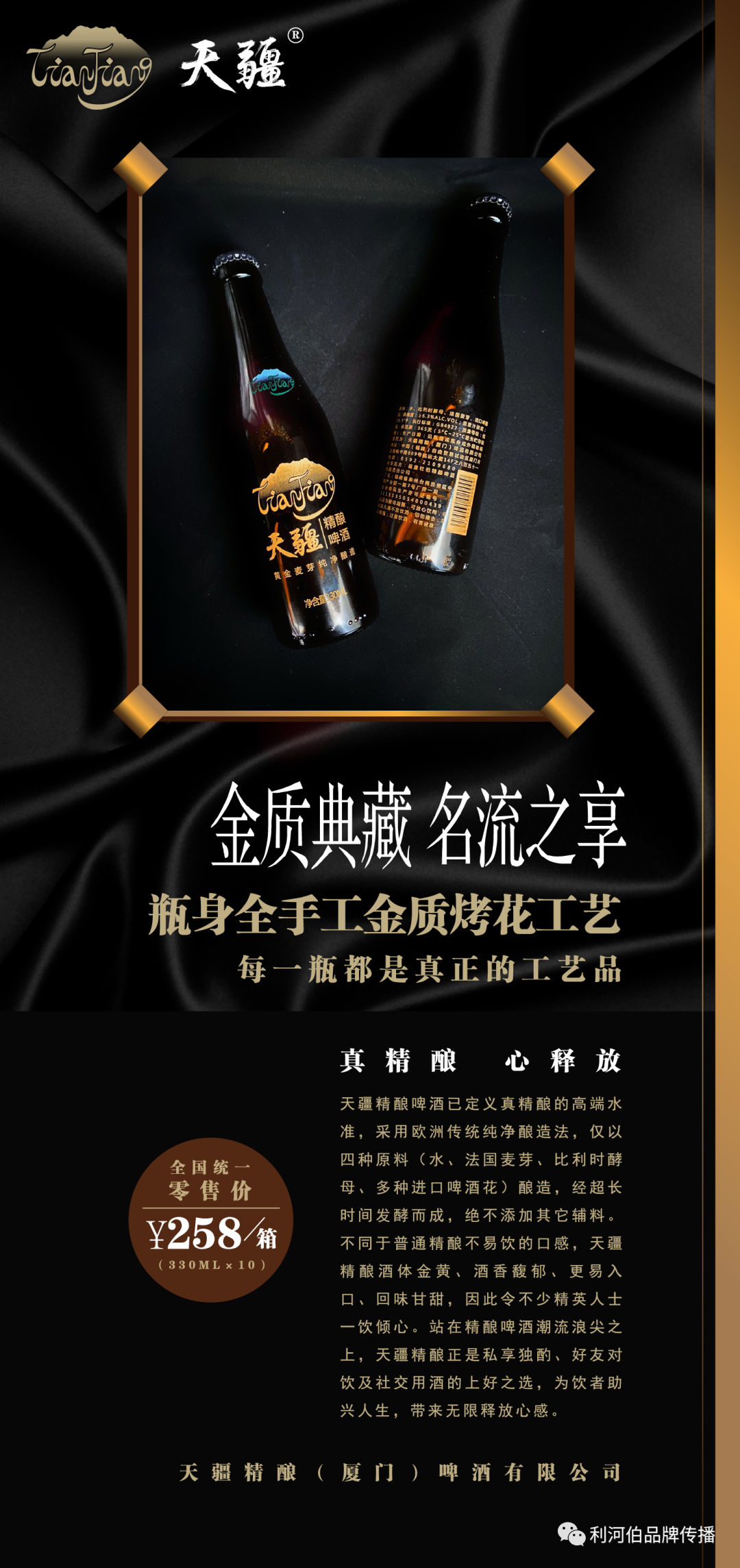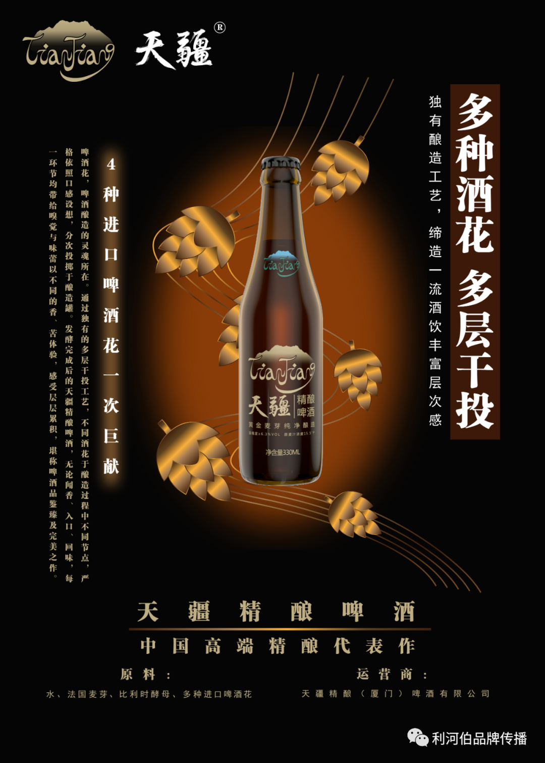 项目案例:高端精酿啤酒品牌打造,从0到1完成品牌全案策划&设计。具体包括:品牌定位、广告语、产品卖点梳理、LOGO&产品包装&品牌形象推广设计、TVC & 短视频创意制作、渠道推广活动(品介会)形象包装与资料讲解等工作。仅采用水、比利时酵母、法国大麦芽、多种进口啤酒花酿造,绝不添加其它廉价辅料,因此带来15.5 °P超高原麦汁浓度。独有的“多种酒花多层干投”工艺,缔造一流酒饮的丰富层次感,无论闻香、观色、入口、回味,每一环节均有不俗体验。同时具有香、甘、绵、柔、醇厚等多种感受,使得品鉴它成为高级享受。适合于精英男士居家独酌、好友分享、高端社交宴请等场景。全国统一零售价:¥258/箱(330ML×10瓶)产品LOGO&包装设计:
