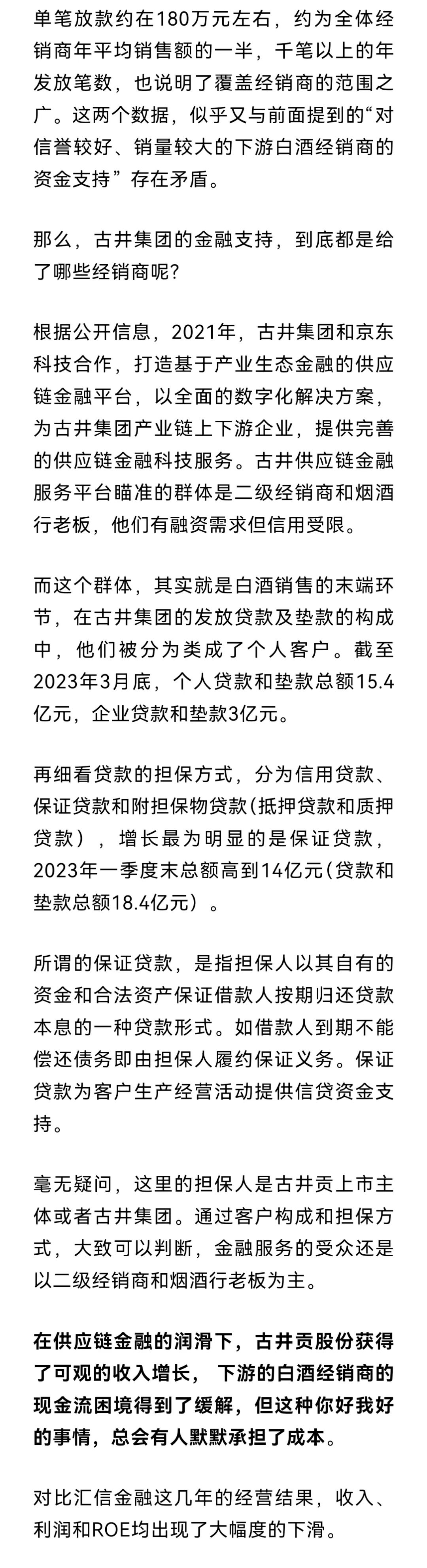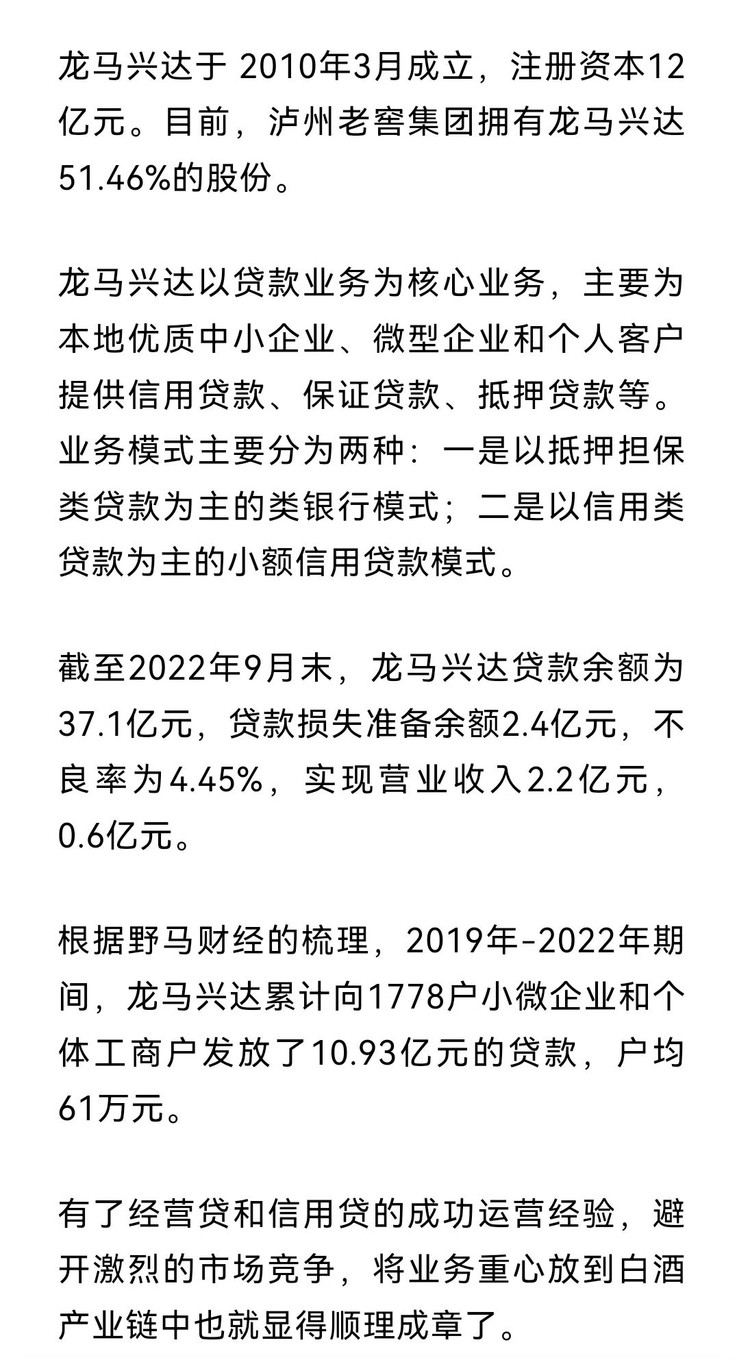 不同的是,古井贡的金融业务为集团100%控股,基本上依托于自有资金完成放款,业务体量明显地有所控制,同时也不追求更高的利润率。泸州老窖的龙马信达为控股子公司,自有资金少杠杆率高,有外部公司参股的情况下,对利润的要求应该不至于像古井贡这般极端。