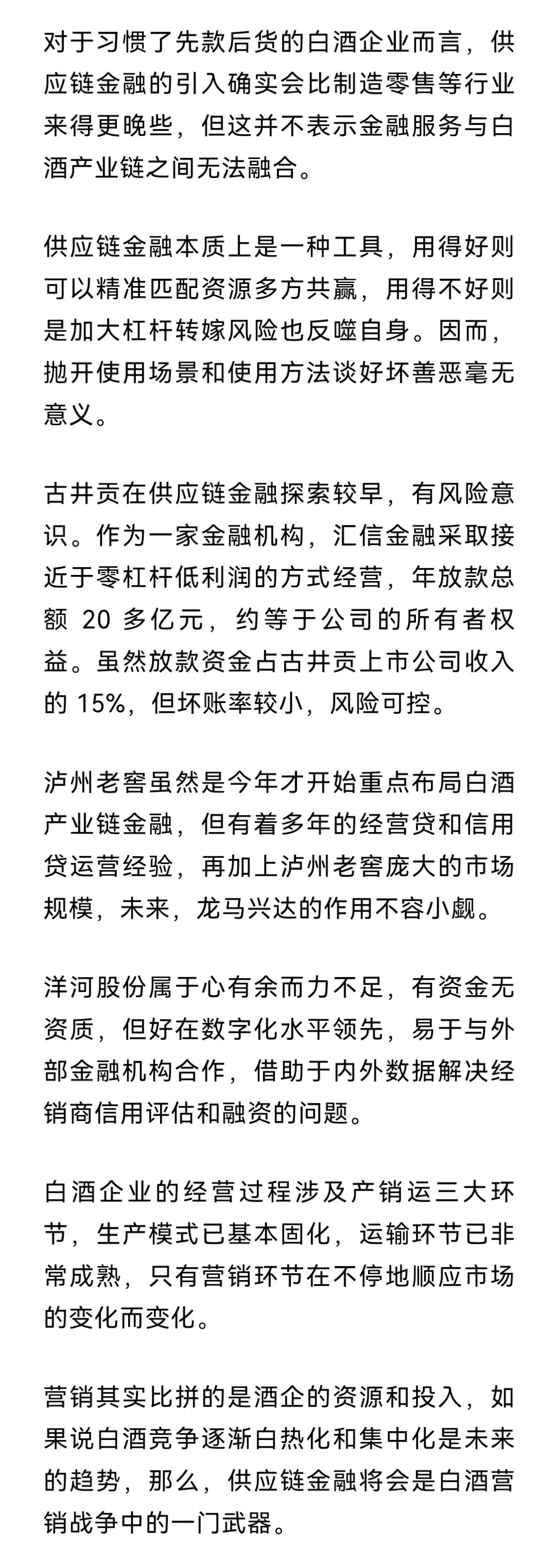 白酒企业作为上下游产业链中的核心企业,随着竞争的深化,信息流、资金流和物流数据的积累,供应链金融或许将成为下一个战场。