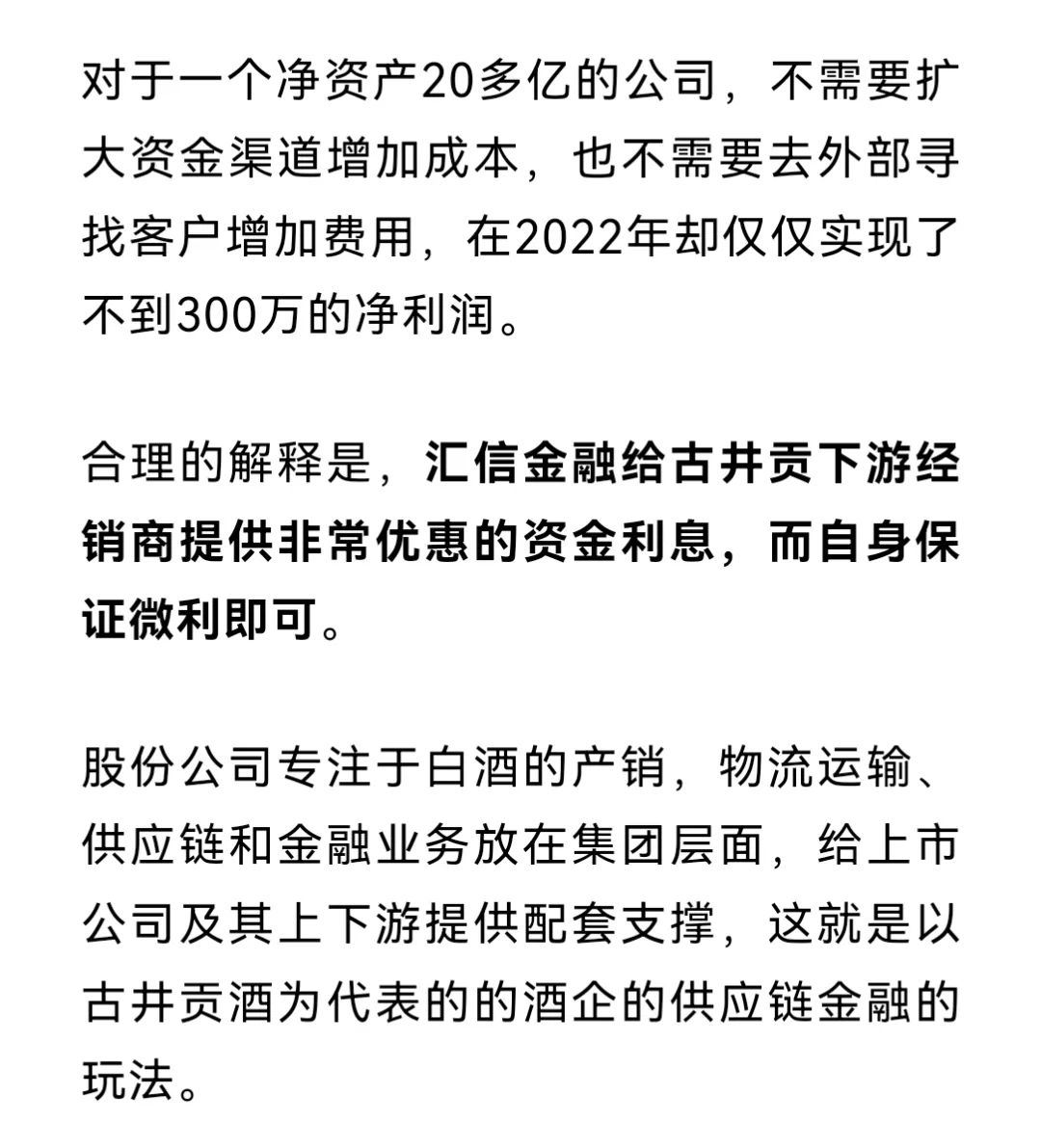 古井贡上市主体并不直接参与类金融业务,而是由古井集团下属的全资子公司安徽汇信金融开展。