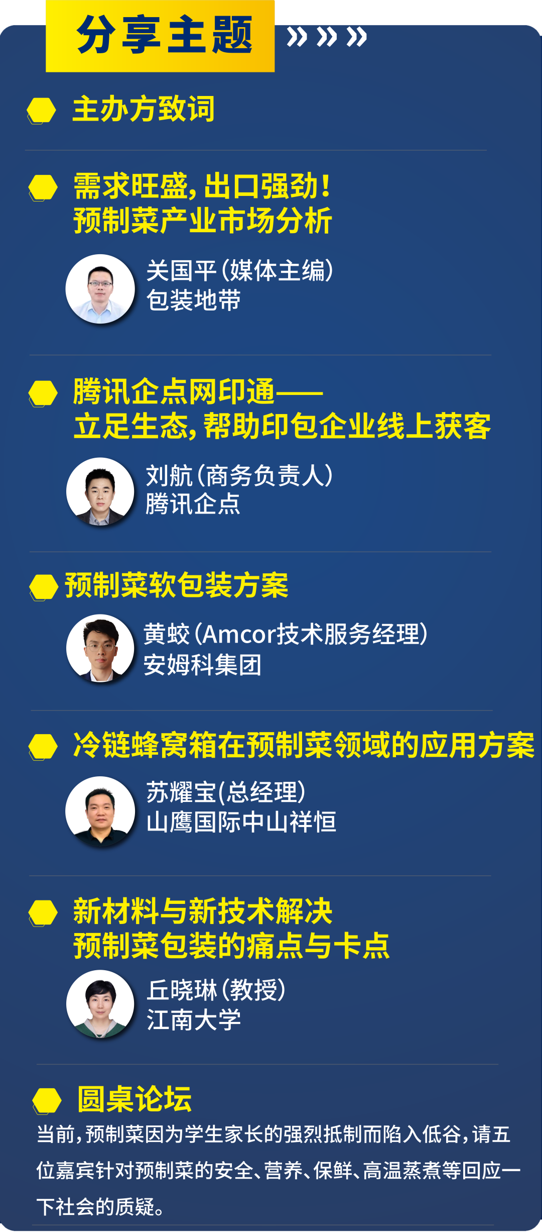 展会期间,将由包装地带&swop&餐包联共同举办同期论坛《万亿包装新赛道:预制菜包装新机遇》,邀请到江南大学、腾讯企点、安姆科、山鹰国际(中山祥恒)、包装地带的五位重磅嘉宾,从新材料、新包装、软包装方案、出口市场前景、预制菜爆品营销、冷链包装、预制菜包装获客、数字化转型等多方面集思广益,为预制菜包装创新赋能、降本增效、输送能量,推动预制菜产业高质量发展!