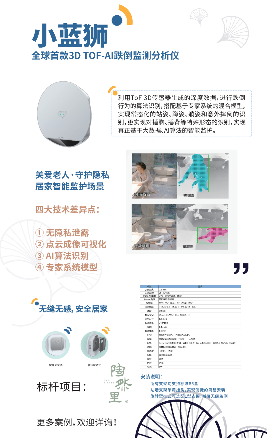 作为智慧康养产业的领先解决方案,小蓝狮凭借纳米波段光电模组及AI芯片的集成,实现了可视化的点云成像模式,在家居空间特别是卫浴空间的跌倒监测场景中,构建了无隐私泄露的解决方案。