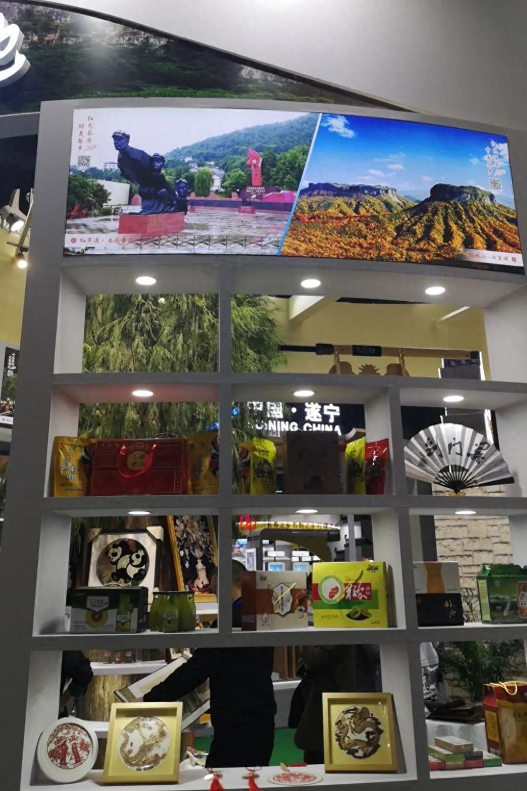 苍溪县文旅体局组织歧坪手工真丝挂毯、唤马剪纸、岳东手工挂面、笋壳画以及猕猴桃饮料、果干、酵素等文旅商品参展。