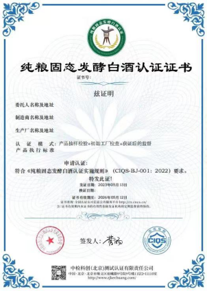 从2022年起正式实施的白酒“新国标”对白酒产品的品质提出了更高的要求,标志着中国白酒行业全面规范时代的到来,以品质为导向,以品牌为根本。同时,随着消费者越来越追求健康和品质,在行业消费结构持续调整和消费升级的大趋势下,"纯粮酒"概念也逐渐深入人心。品质好、品牌优的纯粮白酒,在中国酒业的新赛道下,或将成为竞争的核心要素,更容易获得消费者的青睐。对国家标准和消费需求做出积极回应,截至目前四川川酒集团、叙府,山西梨花春、汾阳王、汾杏、庞泉,宗酒,贵州国威酒业、远明酱酒、五星酒业,天津芦台春,重庆江小白,河南杜康,湖北绣林玉液,甘肃滨河,青海威远酒业,浙江政宇,山东杨湖酒庄、今缘春等全国白酒核心产区多家大型白酒生产企业,参与纯粮固态发酵白酒认证工作,并顺利通过专业认证,获得由中检科创颁布的“纯粮固态发酵白酒认证”证书,打造精品白酒新标杆,以品质实力成就品牌新高度。那么,纯粮固态发酵白酒认证是什么?为何它对白酒企来说那么重要?“纯粮固态发酵白酒认证”是中检科创(北京)测试认证有限责任公司依据经国家认监委备案的《纯粮固态发酵白酒认证实施规则》,委派国内白酒领域资深专家对申请企业生产过程中涉及的厂址环境、原辅料采购、酿造过程全流程质量管控、HACCP食品安全管控等环节进行全面细致的检查,对原酒产能以及储能进行核查,同时对抽样的产品进行安全检测、纯粮固态鉴定和感官品评,评定企业产品满足《纯粮固态发酵白酒认证实施规则》的过程。中检科创作为国内权威的白酒认证机构,经国家认监委批准的第三方认证机构,为企业提供认证、检测、标准、溯源等“一站式”服务,在酒类食品安全领域拥有丰富的认证检测经验和技术优势。目前,除了已经拿到证书的企业外,还有十几个企业正处于准备和审核的过程中,随着大众对优质白酒需求的不断增长,以及纯粮固态发酵白酒的兴起,“纯粮固态发酵白酒认证证书”的出台,不但可以保护企业的质量,同时也是一个不可多得的质量标准。