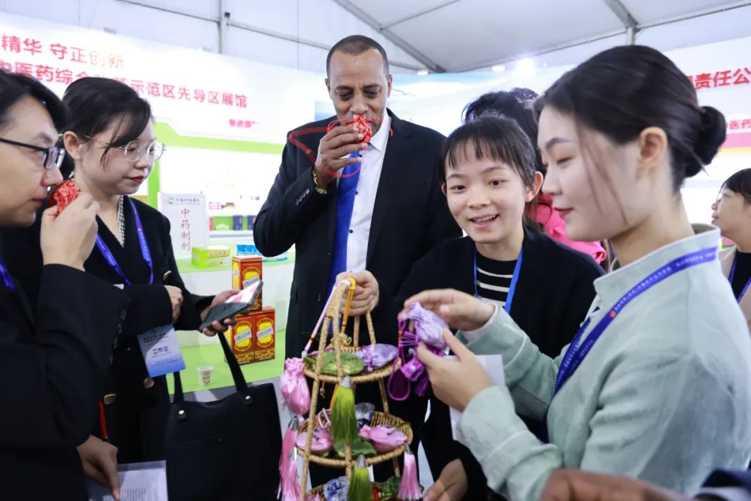 整个会场内充满浓郁的中医药文化氛围,参展的项目中既有中医文化的展现,也有中医技术的体验,还有中药茶饮的品鉴,中药香囊更是凭借一己之力成为全场焦点,吸引了埃塞俄比亚大使馆副馆长一行、医疗单位及企业同仁、各路媒体及参展群众围观体验。