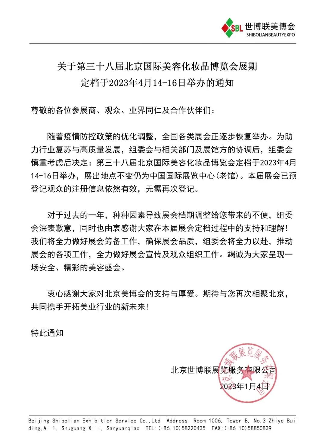 关于第三十八届北京国际美容化妆品博览会展期定档于2023年4月14-16日举办的通知