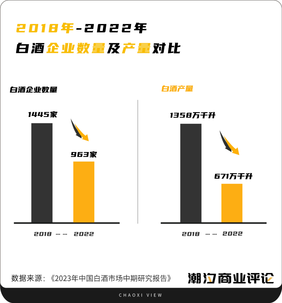 再加上,白酒市场已进入存量博弈的阶段。《2023年中国白酒市场中期研究报告》显示,2018-2022年,全国规模以上白酒企业从1445家下降到963家,产量从1358万千升下降到671万千升。这意味着,白酒行业正在面临剧烈的市场出清。此种情况下,能吸引更多用户群体的企业无疑更具竞争力。