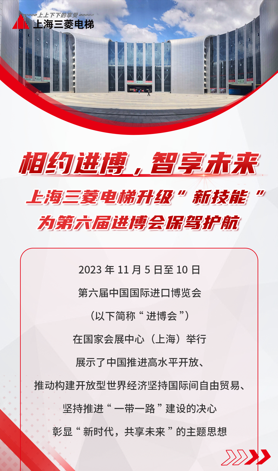 上海三菱电梯作为盛况空前的第六届进博会主办场地——国家会展中心(上海)419台电梯设备提供方和服务方,台前幕后又是哪些高科技产品与数智服务在保驾护航呢?