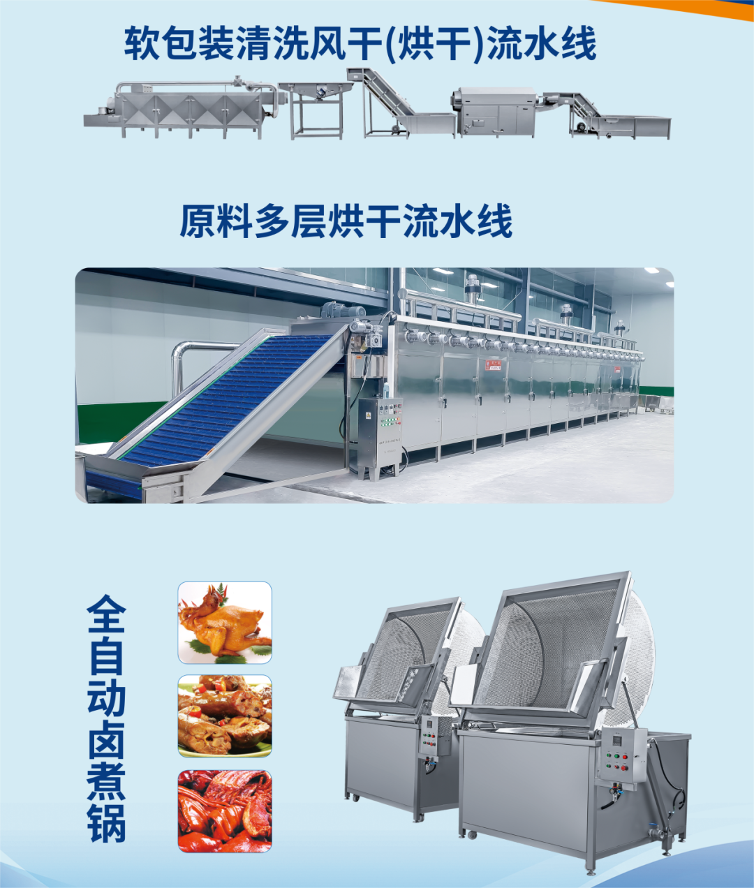 公司主营产品以线型设备及多点传动设备为主,其中包括:油炸线、巴氏杀菌线、清洗线、蒸煮漂烫线、肉食加工滚揉斩拌等线型设备。油炸设备主要用于坚果类、面食类、休闲类、罐头类、肉食类、调理品类、蔬菜类、海产品类等产品;清洗设备、漂烫设备广泛应用于地瓜、土豆、枸杞、果蔬及包装袋的清洗、蒸煮和漂烫;巴氏杀菌设备主要用于蔬菜、腌制品、低温肉制品、酸奶、果冻等食品的巴氏杀菌;风干机主要用于包装袋制品、饮料、食品等大的干燥除水工作。