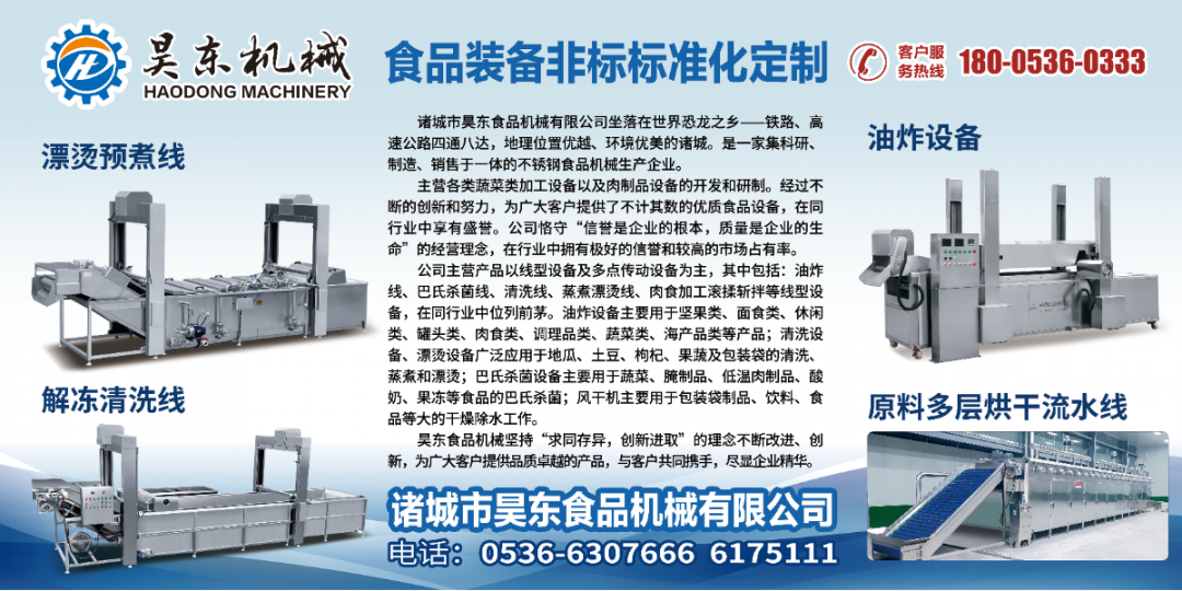 诸城市昊东食品机械有限公司一家集科研、制造、销售于一体的标准化(非标)食品机械生产企业,主营各类蔬菜类加工设备以及肉制品设备的开发和研制。公司恪守“信誉是企业的根本,质量是企业的生命”的经营理念,在行业中拥有极好地信誉和较高的市场占有率。