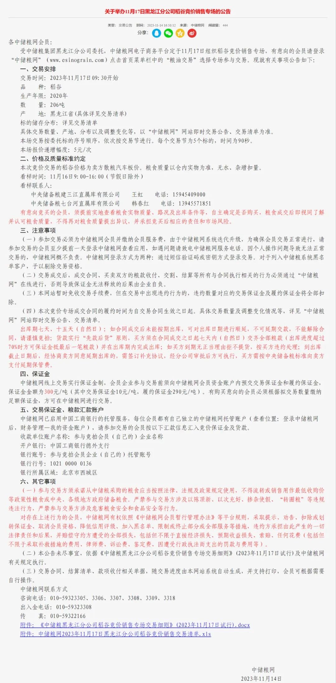 关于举办11月17日黑龙江分公司稻谷竞价销售专场的公告