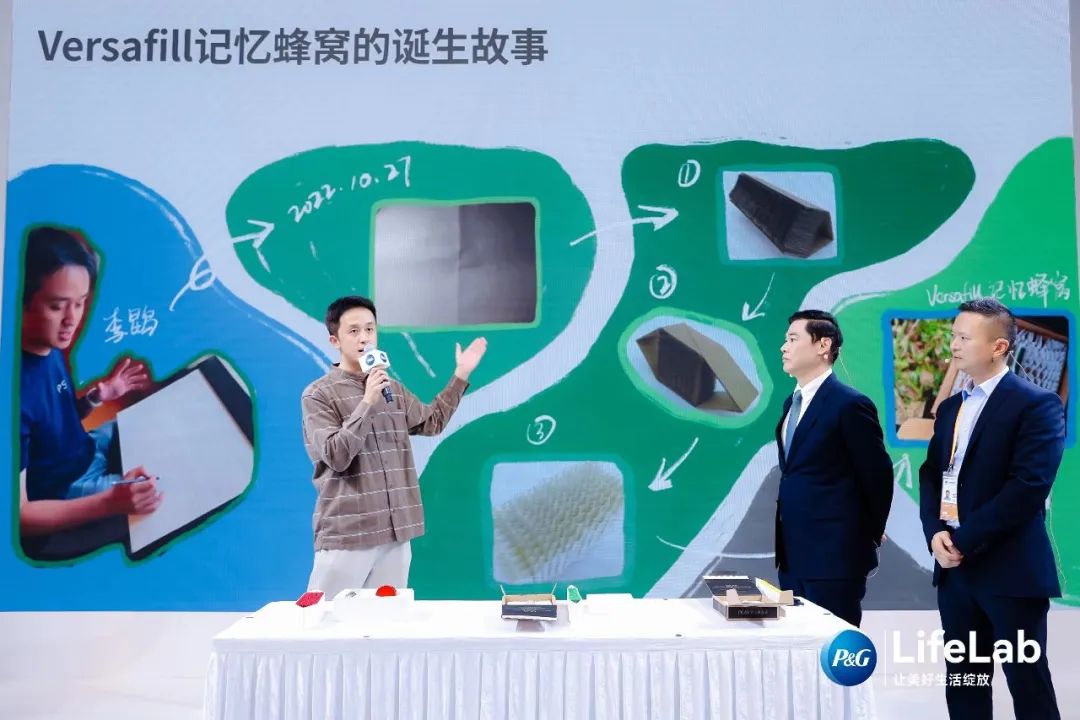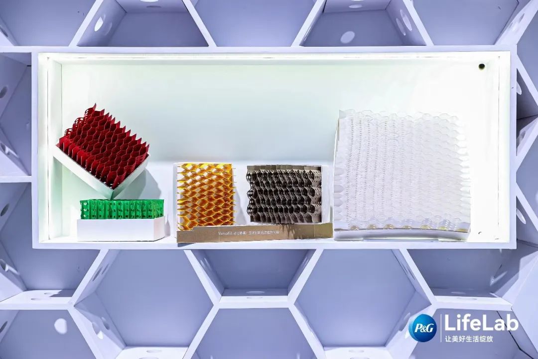 今年进博会,宝洁全球首发的Versafill记忆蜂窝,灵感和元素来自于大自然的蜂窝结构,采用100%纸浆原材料,并通过材料学,力学,结构和几何的巧妙设计以及多次测试,使其具备柔性、优质、绿色的特性,让原本柔软的纸张拥有强大的保护力量。