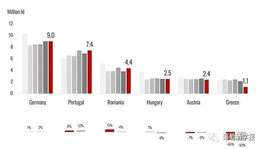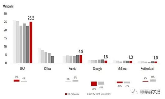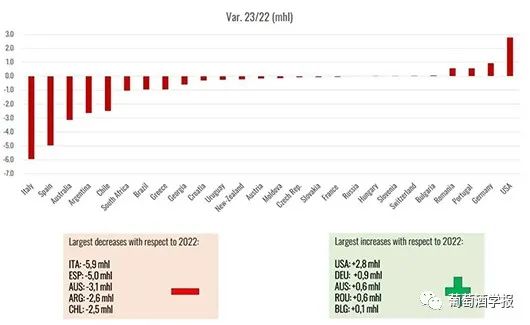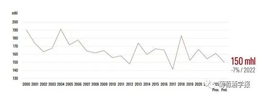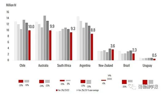 报告预测,由于极端的气候条件,2023年南半球及欧盟一些主要国家的葡萄收成出现直线下降,这也导致2023年全球葡萄酒产量创60年来最低水平。2023年全球葡萄酒产量,预估在241.7亿升至246.6亿升之间,这一数字较2022年下降了7%。 这将是自1961年(214亿升)以来的最低产量,甚至低于2017年的历史较低产量水平(248亿升)。这一产量下降主要是由于两个半球主要葡萄酒生产国的产量大幅下降。在南半球,澳大利亚、阿根廷、智利、南非和巴西的年增长率在-10%至-30%之间,而在北半球,意大利、西班牙和希腊这些国家是生长季节受恶劣气候条件影响最严重的国家。只有美国和少数欧盟国家,如德国、葡萄牙和罗马尼亚,得益于有利的气候条件,产量接近平均水平或高于平均水平。 极端的气候条件——如早霜、暴雨和干旱——严重影响了全球葡萄酒的产量。但是,在全球消费下降而世界许多区域的库存很高的情况下,预期的低产量可能使世界市场达到平衡。北半球欧盟葡萄酒产量变化情况(2000年-2023年) 2023年欧盟的葡萄酒产量预计150亿升,同比减少了11.2亿升。相对而言,这一产量比2022年低7%,比过去五年平均水平低8%。总体而言,2023年欧盟的产量占全球总产量的61%。 如果这一预测在未来几个月得到证实,这将是自本世纪初以来第三个低产的年份,仅次于2017年(141亿升)和2012年(148亿升)。欧盟主要国家葡萄酒产量变化情况(2018年-2023年) 法国成为全球最大葡萄酒生产国,产量预计45.8亿升,与2022年水平一致,较过去5年平均水平高3%。尽管一些地区与2022年相比出现了负增长,波尔多和西南地区就是这种情况,遭受霜霉病的侵袭。朗格多克-鲁西永遭受了热浪和干旱的袭击。预计干邑、科西嘉和香槟产区将出现较高的产量。 意大利2023年的葡萄酒产量显著下降,预估为43.9亿升(较2022年下降12%)。这是自2017年历史最低产量以来的最低产量。导致低产量的原因有很多,特别是中部和南部的暴雨导致霜霉病肆虐。此外,部分意大利葡萄园遭受了洪水、冰雹和干旱的袭击。欧盟其他国家葡萄酒产量变化情况(2018年-2023年) 西班牙全球第三大葡萄酒生产国,预估产量为30.7亿升,与2022年相比下降了14%,与过去五年的平均水平相比下降了19%。预计2023年的水平将是过去20年来的最低水平。严重的干旱和极端的气温侵袭了葡萄园。最大的葡萄酒产区卡斯蒂利亚-拉曼查(Castilla-La Mancha)的产量预计将比去年减少10%至15%。 至于欧盟其他主要葡萄酒生产国,预计德国(9亿升,+1% / 2022年)、葡萄牙(7.4亿升,+8% / 2022年)和罗马尼亚(4.4亿升,+15% / 2022年)将实现正增长。在这三个国家,预计产量也比过去五年的平均水平分别高出2%、12%和4%。同样,匈牙利(2.5亿升,+ 1% / 2022)、保加利亚(0.9亿升,+7% / 2022)和斯洛文尼亚(0.6 亿,+ 6% / 2022)的产量都比2022年有所增加,但低于过去五年的平均水平。总的来说,在所有这些国家,生长季节的炎热和干燥以及夏季降雨导致了高产量。 奥地利是欧洲第七大葡萄酒生产国,预计2023年的葡萄酒产量为2.4亿升(比2022年下降7%)。葡萄生长季节受到了风暴的严重影响。与2022年相比,产量下滑最大的国家之一是希腊,预计2023年的葡萄酒产量为1.1亿升。这一数量不仅比去年大幅下降(-45%),也低于过去五年的平均水平(-50%)。这主要是由于春季大雨导致葡萄病害(尤其是霜霉病),加之夏季的高温和干旱对葡萄藤造成了严重影响。捷克的葡萄酒产量为0.5亿升,比2022年低13%,比五年平均水平低14%。克罗地亚2023年的产量为0.4亿升,比2022年低41%,比五年平均水平低46%。低收成主要是受到了恶劣天气条件和霜霉病的影响。斯洛伐克的葡萄酒产量估计为0.3亿升,比2022年低20%。北半球欧盟以外国家葡萄酒产量变化情况(2018年-2023年) 每年的这个时候,中国的葡萄收成数据还无从获得。中国2023年产量的初步预测将在2024年上半年进行。 至于东欧国家,俄罗斯的葡萄酒产量估计为4.9亿升,这一数字与2022年的产量一致,比过去五年的平均水平高出9%。 格鲁吉亚2023年的葡萄酒产量估计为1.5亿升,与2022年的产量相比下降28%,比五年平均水平低19%。这一相对较低的产量是由于恶劣的天气条件,如暴雨、冰雹和强风,严重影响了该国东部的葡萄酒产区。同样,摩尔多瓦2023年的葡萄酒产量预计1.3亿升,与2022年相比下降10%。 预计,瑞士2023年的葡萄酒产量相对较高,达到1亿升,比2022年高出4%,比过去五年的平均水平高出14%。南半球葡萄酒产量变化情况(2000年-2023年) 南半球的葡萄酒产量预计将远低于2022年。澳大利亚、阿根廷、智利、南非和巴西都受到恶劣天气条件的严重影响。唯一的例外是新西兰,它是唯一一个2023年产量高于五年平均水平的国家。 在经历了2021年创纪录的收成和2022年产量相对下降之后,2023年南半球的葡萄酒产量估计为45亿升,与2022年相比不仅减少了19%,而且与过去五年的平均水平相比也下降了18%。这是自2003年以来的最低产量记录,归因于所有主要葡萄酒产区在生长季节发生的极端气候事件。总体而言,2023年,南半球的葡萄酒产量预计将占全球总产量的19%。 与2022年相比,所有南美主要葡萄酒生产国的产量都大幅下降。智利是2023年南半球最大的葡萄酒生产国,葡萄酒产量为10亿升,比去年的高产量低20%,比5年平均水平低18%,收成受到野火和干旱的严重影响。2023年,由于春季霜冻和冰雹,阿根廷的葡萄酒产量仅为8.8亿升(比2022年减少23%)。南