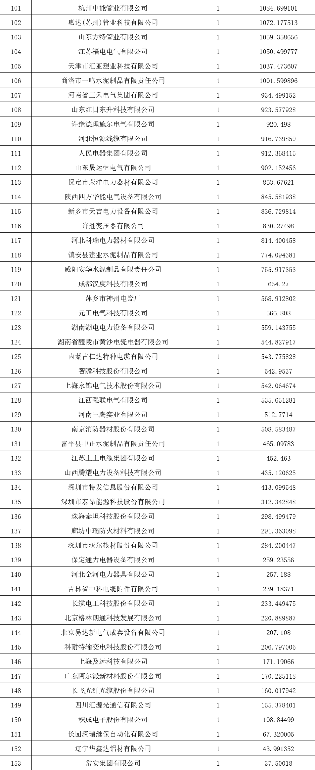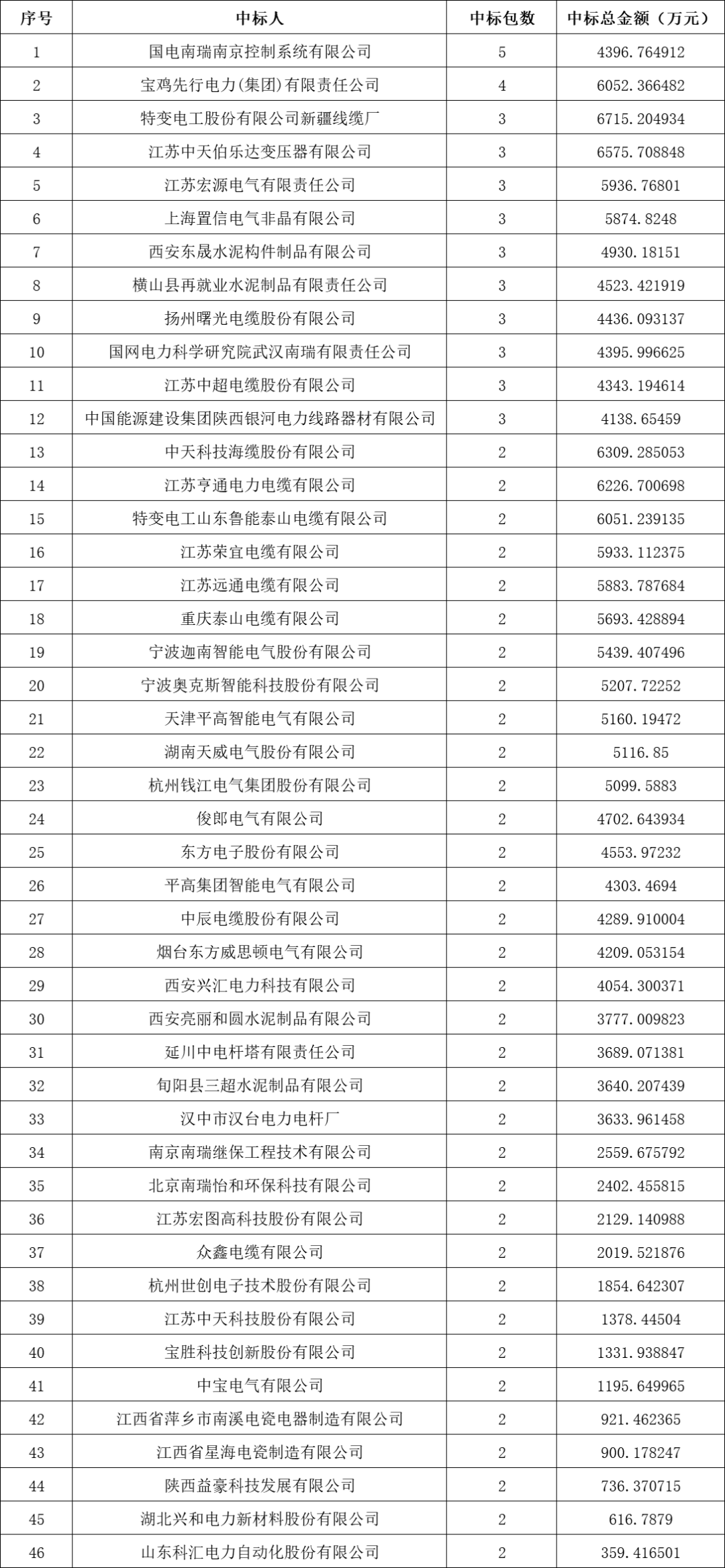2022年,国网陕西省电力有限公司共进行三个批次的配网设备材料(含其他)协议库存招标采购项目,分别为:1、国网陕西省电力有限公司2022年第一次配网设备材料(含其他)协议库存集中招标采购项目;2、国网陕西省电力有限公司2022年新增配网设备材料(含其他)协议库存集中招标采购项目;3、国网陕西省电力有限公司2022年第二次配网设备材料(含其他)协议库存集中招标采购项目。上述项目共有153家企业中标,中标金额超33亿元!其中,仅46家企业中标两包及以上,中标包数最多的企业为国电南瑞南京控制系统有限公司,中标金额最多的企业为特变电工股份有限公司新疆线缆厂。本期内容整理了国网陕西省电力有限公司2022年上述批次物资协议库存招标采购的中标企业中标包数排行榜,汇总如下表