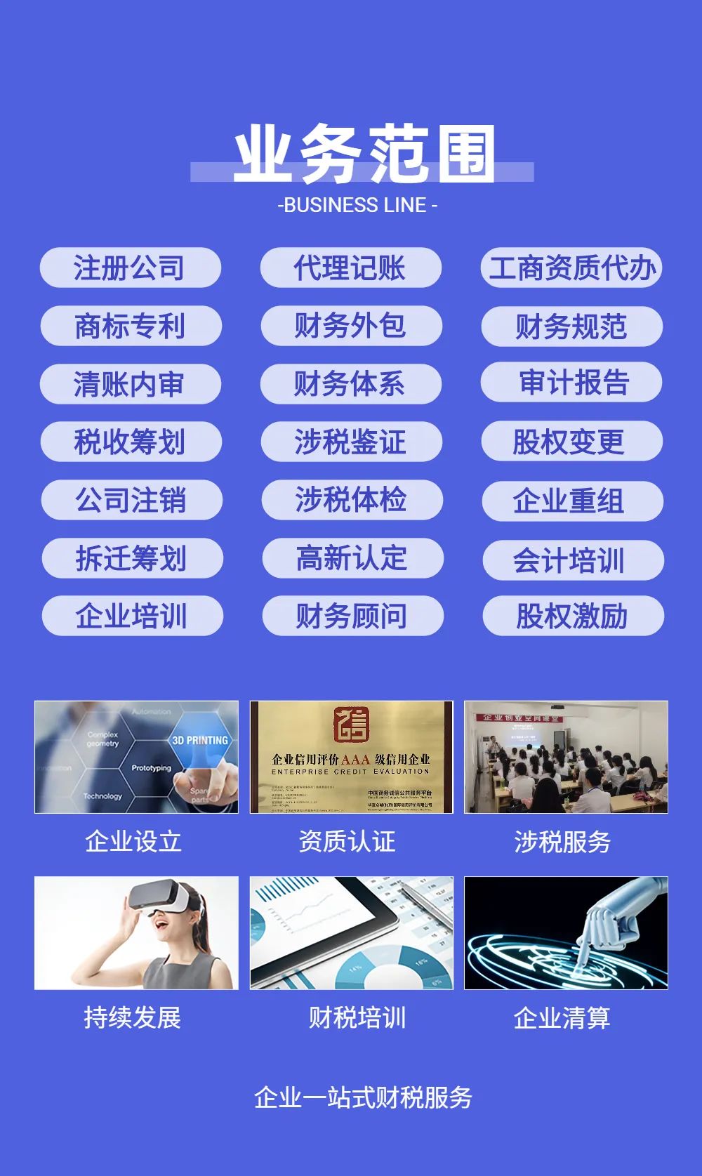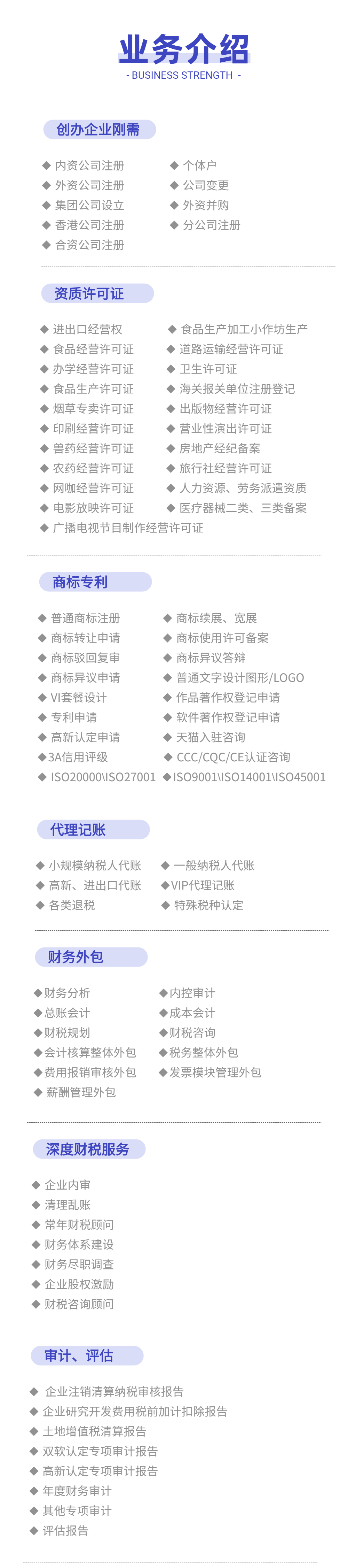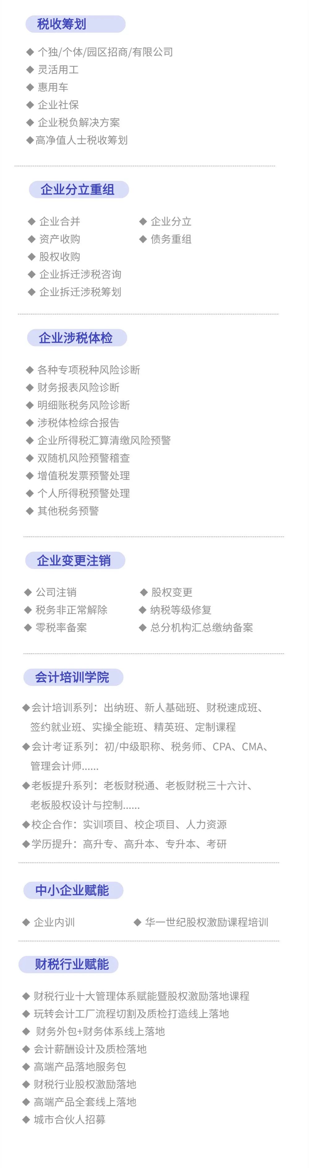 江之都财税拥有16年财税服务经验,具备专业的财税团队。从公司注册,财税记账,商标注册、工商变更、公司注销、财务外包、清账内审、财务顾问、财务体系、企业重组、审计评估、涉税鉴证报告、股权激励、会计培训等,为企业提供专业的财税服务,解决企业困扰。江之都财税,让财税无忧,让创业更简单!