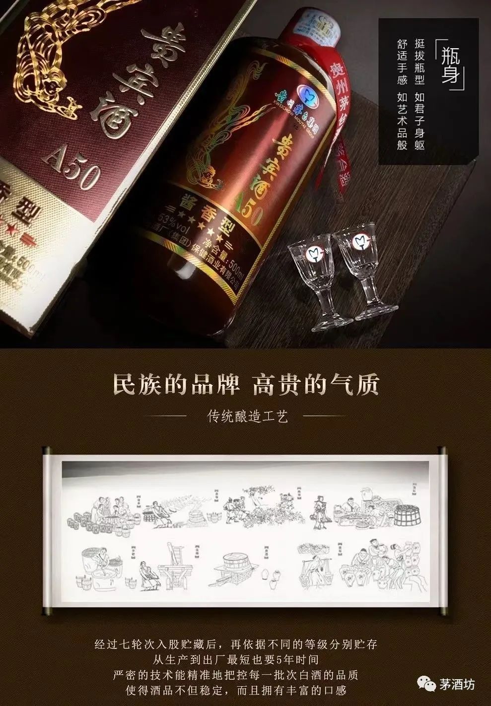 茅台集团贵宾酒a50采用了茅台传统的酿造工艺,即"一二九八七"工艺。这种工艺使用优质小麦、高粱为原料,经过两次投料、九次蒸煮、八次发酵、七次取酒,再经过多年窖藏和精心勾兑而成。这种酿造工艺使得酒体丰满、口感细腻、风味独特。