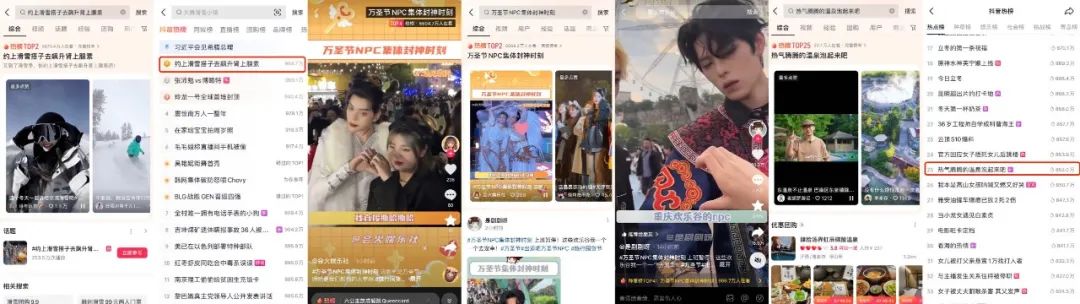 抖音生活服务酒旅行业推出的「旅行囤货节」,锚定节点营销、创新内容、联动达人种草等展开多维营销,助力商家提升品牌声量。为加强抖音平台整体用户的感知度,抖音生活服务紧跟热点与节日创新内容,「旅行囤货节」期间上线5个热点话题,累计曝光量超6亿次,其中3个应季品类话题进入全国TOP榜,话题#约上滑雪搭子去飙升肾上腺素 凭借滑雪运动的刺激与自由感吸引大量用户关注,登上全国榜TOP1, 话题#万圣节NPC集体封神时刻 凭借NPC的高颜值以及花样cos吸引关注,登上全国榜TOP2,话题 #热气腾腾的温泉泡起来吧 以季节反差与冬季温泉雪景的美感,登上全国榜TOP16。高曝光度、高质量内容、高频次热点话题成功带动用户参与其中,提升了活动的声量。