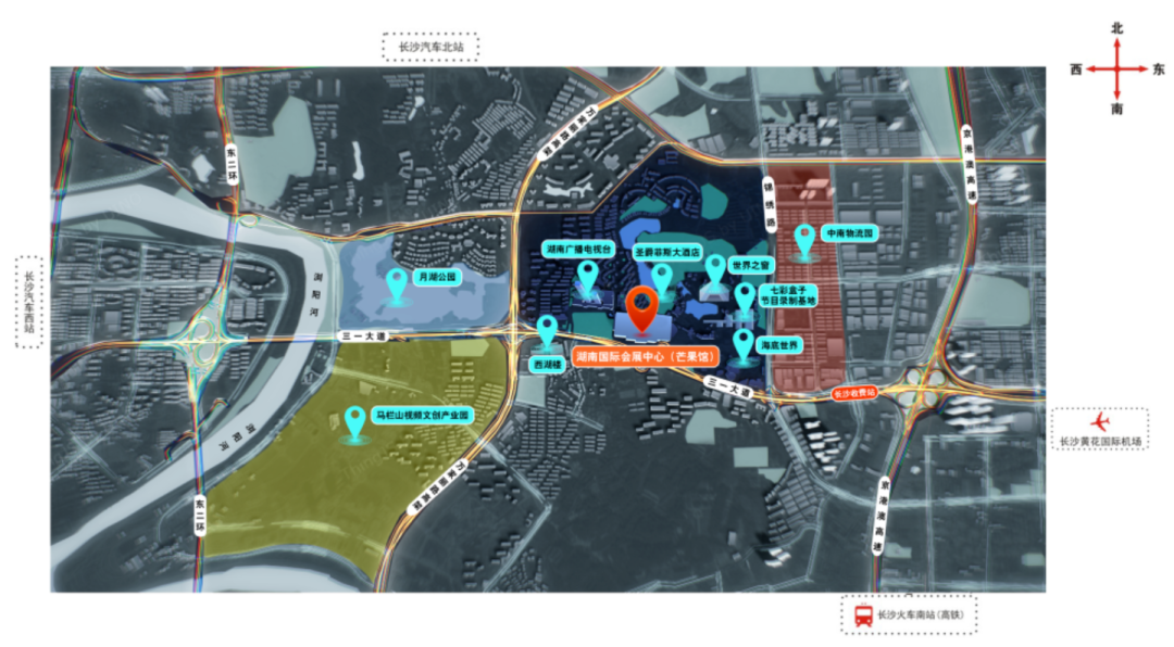 大巴换乘:乘坐民航机场大巴到汽车西站途经湖南广电(湖南国际会展中心)下车