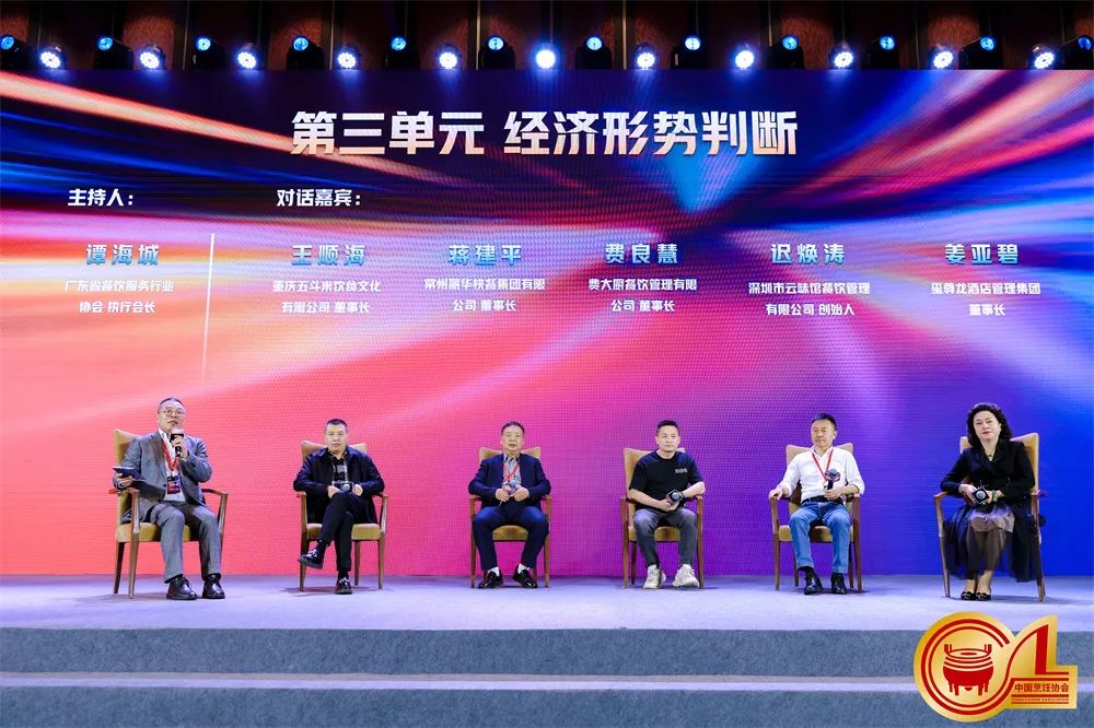 谭海城副会长、五斗米王顺海、费大厨费良慧、云味馆迟焕涛、玺尊龙酒店集团姜亚碧共同开展第三单元“经济形势判断”的讨论