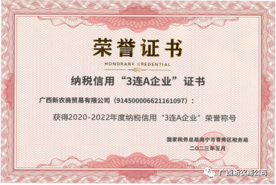 近期,经国家税务总局南宁市青秀区税务局评定,南宁乡村振兴集团下属广西新农商贸易有限公司(以下简称新农商公司)荣获2020-2022年度纳税信用“3连A”企业荣誉称号,该荣誉的获得是对公司纳税信用和能力的最有力认可。